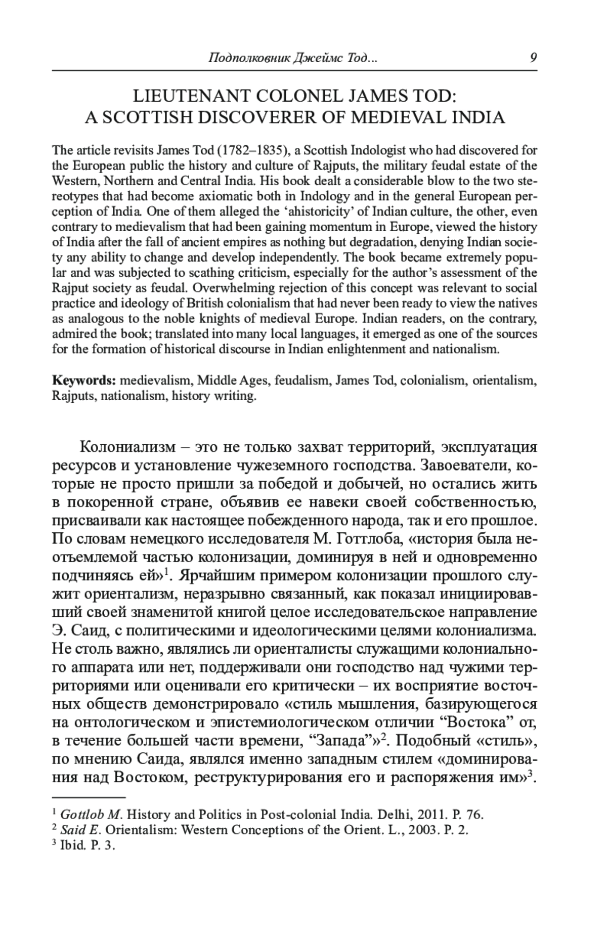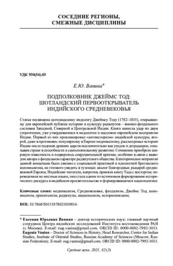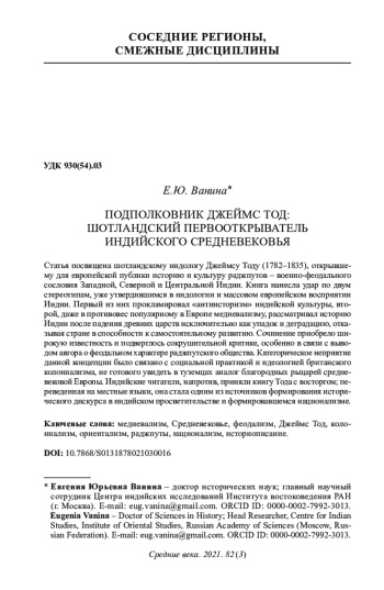Статья посвящена шотландскому индологу Джеймсу Тоду (1782-1835), открывшему для европейской публики историю и культуру раджпутов - военно-феодального сословия Западной, Северной и Центральной Индии. Книга нанесла удар по двум стереотипам, уже утвердившимся в индологии и массовом европейском восприятии Индии. Первый из них прокламировал «антиисторизм» индийской культуры, второй, даже в противовес популярному в Европе медиевализму, рассматривал историю Индии после падения древних царств исключительно как упадок и деградацию, отказывая стране в способности к самостоятельному развитию. Сочинение приобрело широкую известность и подверглось сокрушительной критике, особенно в связи с выводом автора о феодальном характере раджпутского общества. Категорическое неприятие данной концепции было связано с социальной практикой и идеологией британского колониализма, не готового увидеть в туземцах аналог благородных рыцарей средневековой Европы. Индийские читатели, напротив, приняли книгу Тода с восторгом; переведенная на местные языки, она стала одним из источников формирования исторического дискурса в индийском просветительстве и формировавшемся национализме.