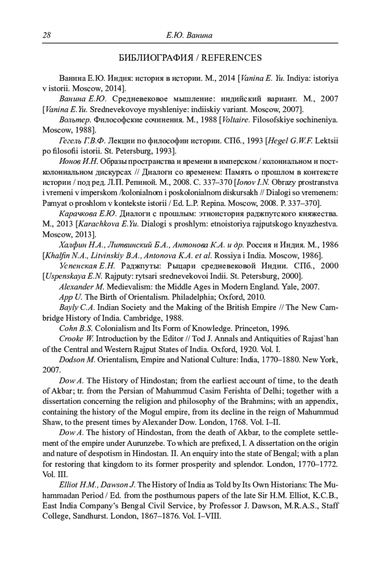 17. 	Elliot H.M., Dawson J. The History of India as Told by Its Own Historians: The Muhammadan Period / Ed. from the posthumous papers of the late Sir H.M. Elliot, K.C.B., East India Company’s Bengal Civil Service, by Professor J. Dawson, M.R.A.S., Staff College, Sandhurst. London, 1867-1876. Vol. I-VIII.