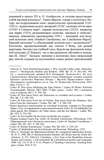3. Полякова М.А. На пути к религиозному обучению населения в эпоху Реформации: история создания Краткого катехизиса Мартина Лютера // Вестник Православн. Свято-Тихоновского гуманитарного ун-та. Сер. IV: Педагогика. Психология. 2016. Вып. 4 (43). С. 68-80.