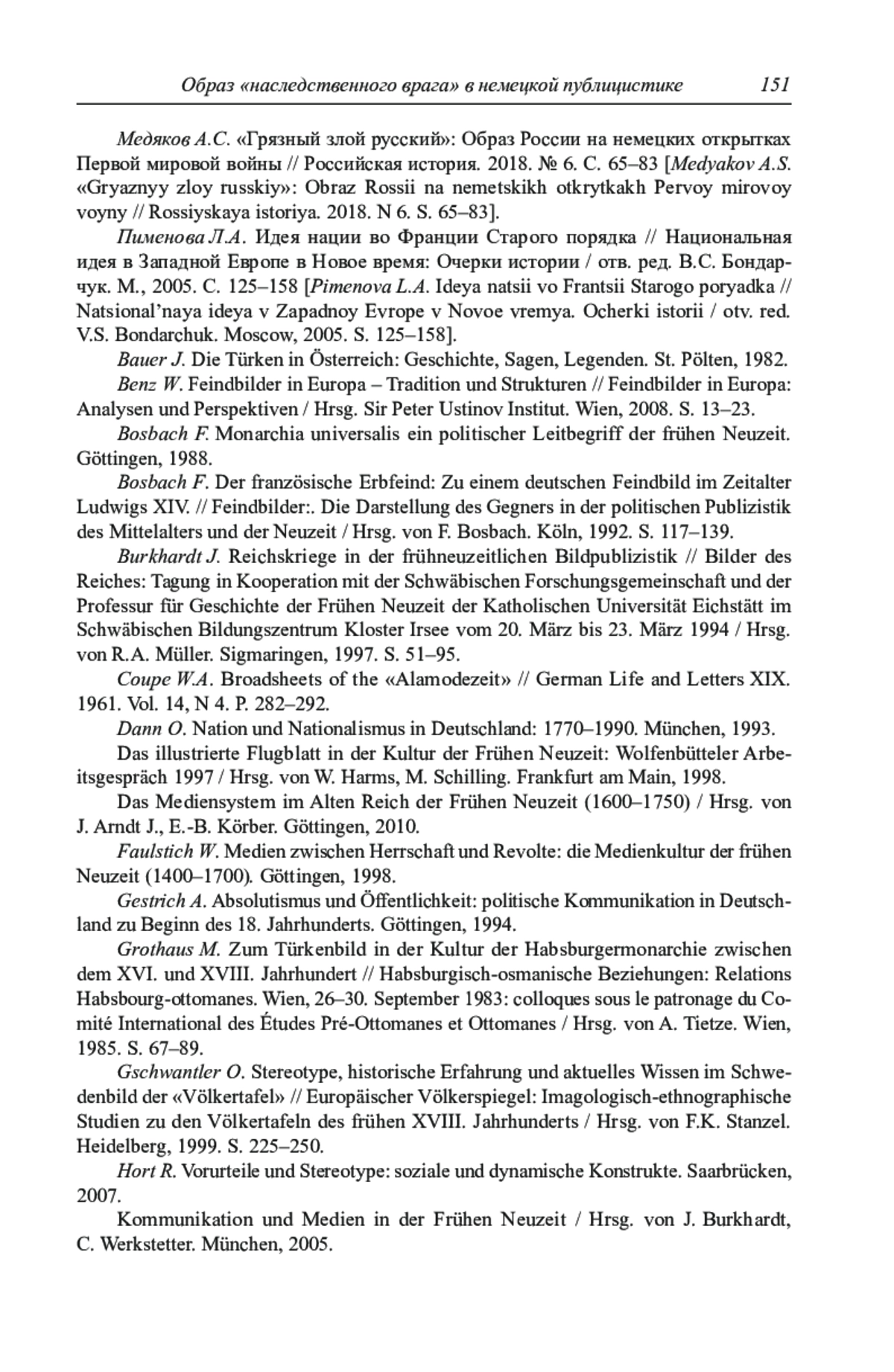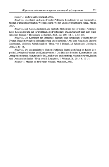 49. 	Wrede M. Das Reich und seine Feinde: Politische Feindbilder in der reichspatriotischen Publizistik zwischen Westfälischem Frieden und Siebenjährigem Krieg. Mainz, 2004.