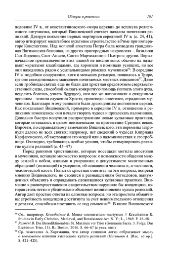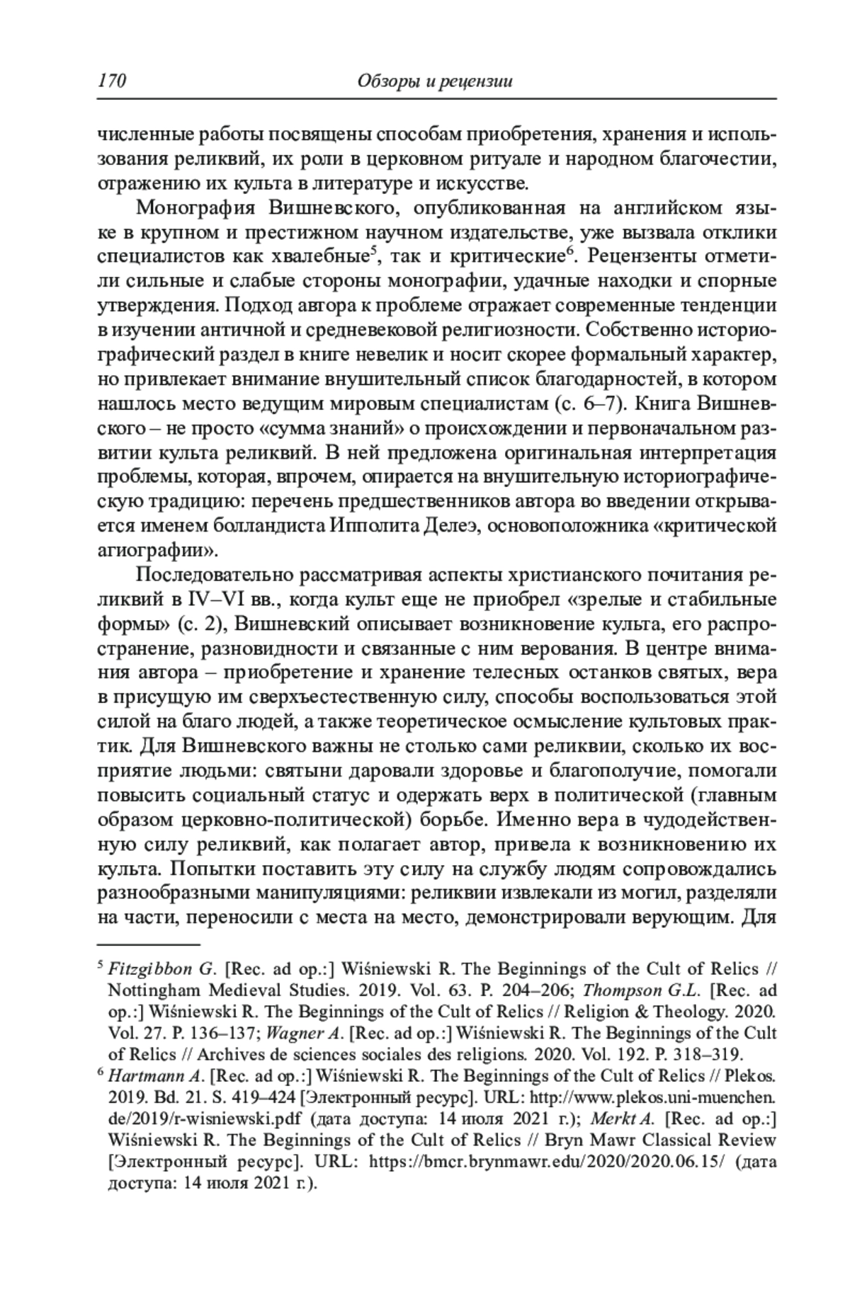 Культ реликвий, унаследованный от поздней античности, стал одной из главных особенностей средневекового христианства. К этой теме обращаются многие медиевисты, поэтому систематический обзор состояния культа в предшествующую эпоху представляет определенный интерес. В своей книге Роберт Вишневский последовательно описывает разные аспекты почитания реликвий в IV–VI вв., обращая особое внимание на способы вступить в контакт со святыней и использовать ее сверхъестественную силу на благо людей. Автор делает интересные наблюдения, которые проливают свет на причины и обстоятельства широкого распространения культа реликвий. Вместе с тем концепция автора вызывает возражения: то, что Вишневский понимает под возникновением культа, можно считать скорее очередным этапом его развития. Рассматривая культ реликвий с определенной точки зрения и руководствуясь средневековыми критериями, автор отрицает его существование до середины IV в. Рецензент высказывает несогласие с этой позицией и приводит свидетельства раннехристианских источников о мемориальном, идеологическом и культовом значении гробниц святых.