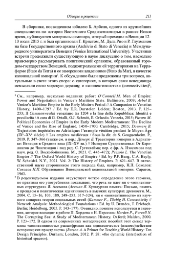 В сборнике, посвященном юбилею Б. Арбеля, одного из крупнейших специалистов по истории Восточного Средиземноморья в раннее Новое время, публикуются материалы семинара, который проходил в Венеции 12– 13 июля 2015 г. и был организован Г. Кристом, М. Дель Рио и Р. Глузманом на базе Государственного архива (Archivio di Stato di Venezia) и Международного университета Венеции (Venice International University). Участники встречи продолжили существующую в науке дискуссию о том, насколько правомерно рассматривать политический организм, образованный городом-государством Венецией, подконтрольными ей территориями на Терраферме (Stato da Terra) и ее заморскими владениями (Stato da Mar), в качестве колониальной империи1.