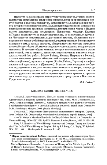 Рецензируемый сборник содержит материалы семинара, который состоялся в 2015 г. в Венеции и был организован в честь выдающегося историка Б. Арбеля. Представленные исследования посвящены истории Венецианской морской империи в период раннего Нового времени, причем особое внимание уделяется осмыслению природы этого государственного образования, повседневным практикам его существования и институциональной среде венецианских владений в Восточном Средиземноморье. 15 статей, написанных специалистами в данной области, охватывают широкий круг тем, включая репрезентацию власти, формы политической коммуникации, распространение новостей, правовой статус физических лиц и кораблей, социальные сети, культурные и религиозные идентичности, миграции, механизмы передачи знания и перемещение материальных объектов. Рецензент дает сборнику высокую оценку, отмечая глубину анализа исторических источников и поиск новых подходов к решению поставленных проблем