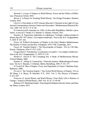 11. Fusaro M. Venetian Empire // The Encyclopedia of Empire / Ed. by J.M. MacKenzie. Chichester, 2016. P. 2173-2183.