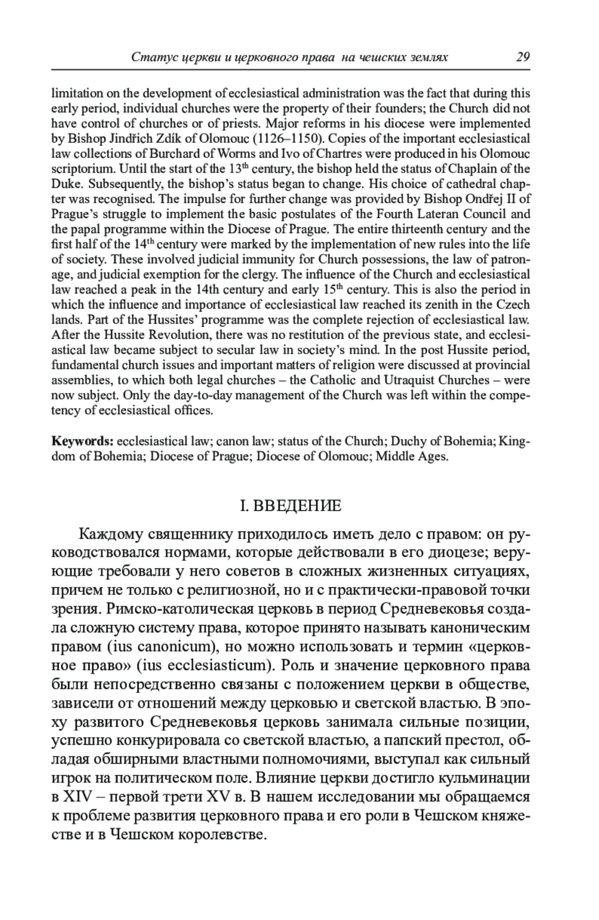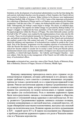 Каждому священнику приходилось иметь дело с правом: он руководствовался нормами, которые действовали в его диоцезе; верующие требовали у него советов в сложных жизненных ситуациях, причем не только с религиозной, но и с практически-правовой точки зрения. Римско-католическая церковь в период Средневековья создала сложную систему права, которое принято называть каноническим правом (ius canonicum), но можно использовать и термин «церковное право» (ius ecclesiasticum). Роль и значение церковного права были непосредственно связаны с положением церкви в обществе, зависели от отношений между церковью и светской властью. В эпоху развитого Средневековья церковь занимала сильные позиции, успешно конкурировала со светской властью, а папский престол, обладая обширными властными полномочиями, выступал как сильный игрок на политическом поле. Влияние церкви достигло кульминации в XIV – первой трети XV в. В нашем исследовании мы обращаемся к проблеме развития церковного права и его роли в Чешском княже - стве и в Чешском королевстве