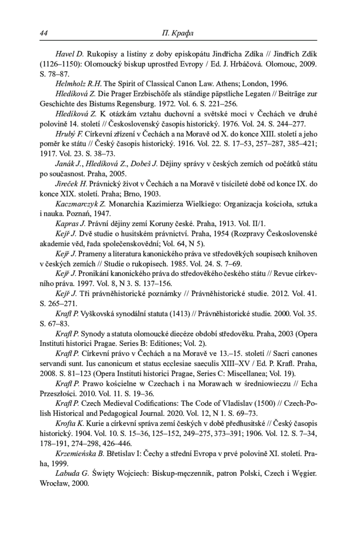 38. 	Krafl P. Církevní právo v Čechách a na Moravě ve 13.-15. století // Sacri canones servandi sunt. Ius canonicum et status ecclesiae saeculis XIII-XV / Ed. P. Krafl. Praha, 2008. S. 81-123 (Opera Instituti historici Pragae, Series C: Miscellanea; Vol. 19).
