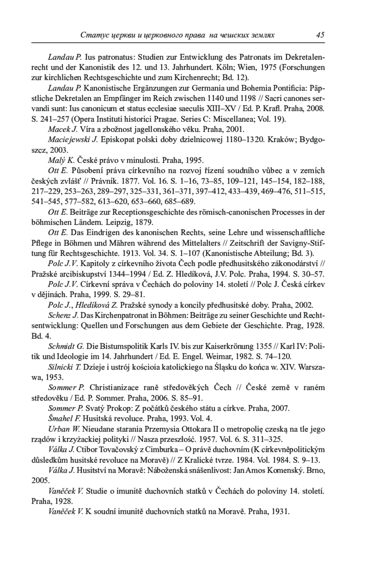51. 	Ott E. Das Eindrigen des kanonischen Rechts, seine Lehre und wissenschaftliche Pflege in Böhmen und Mähren während des Mittelalters // Zeitschrift der Savigny-Stiftung für Rechtsgeschichte. 1913. Vol. 34. S. 1-107 (Kanonistische Abteilung; Bd. 3).