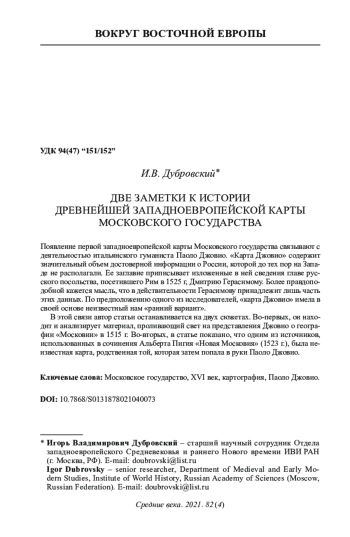 В этой связи автор статьи останавливается на двух сюжетах. Во-первых, он находит и анализирует материал, проливающий свет на представления Джовио о географии «Московии» в 1515 г. Во-вторых, в статье показано, что одним из источников, использованных в сочинения Альберта Пигия «Новая Московия» (1523 г.), была неизвестная карта, родственная той, которая затем попала в руки Паоло Джовио