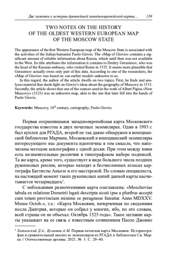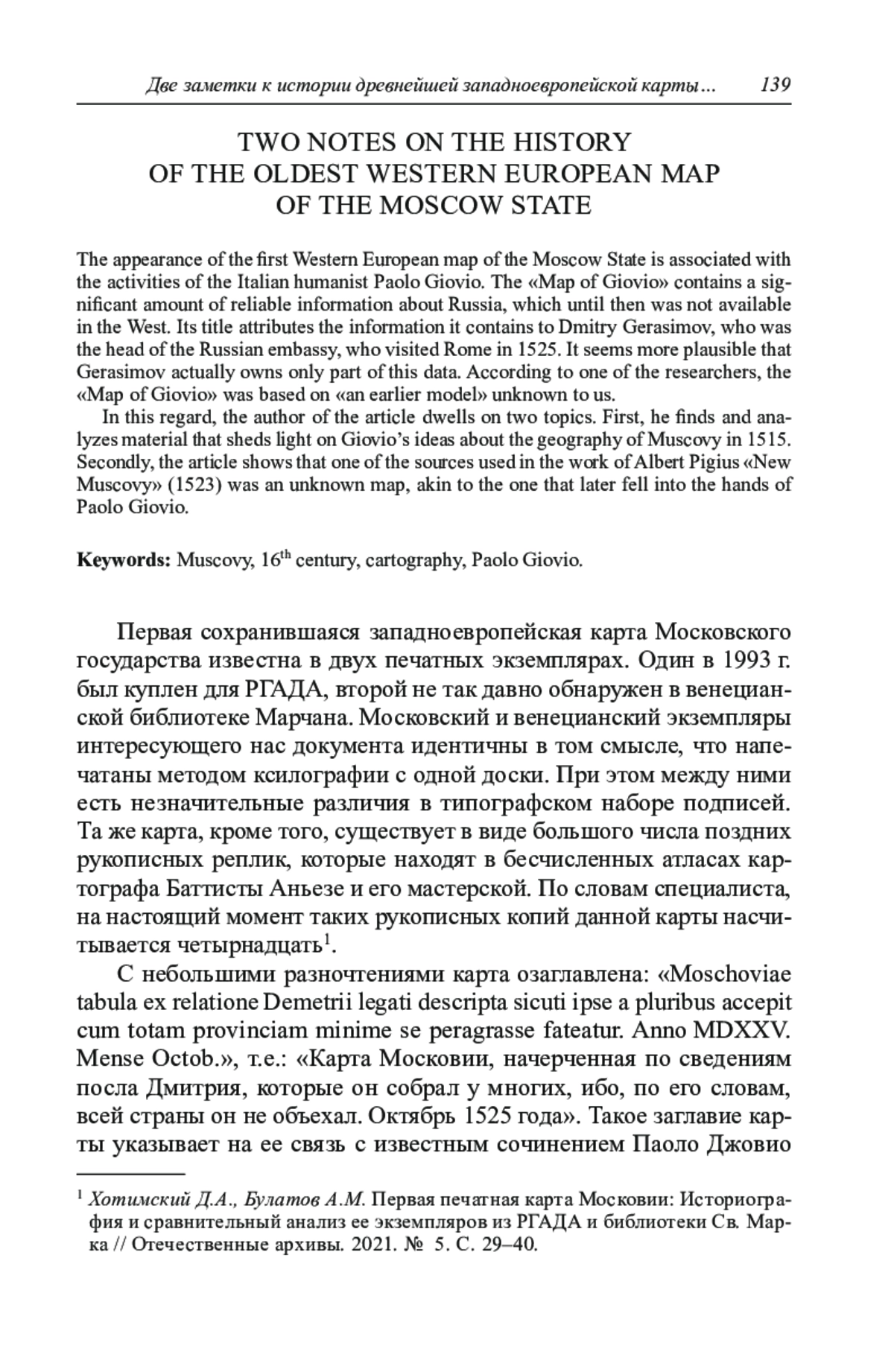 2. Хотимский Д.А., Булатов А.М. Первая печатная карта Московии: Историогра фия и сравнительный анализ ее экземпляров из РГАДА и библиотеки Св. Марка // Отечественные архивы. 2021. № 5. С. 29-40. EDN: EQYXPG