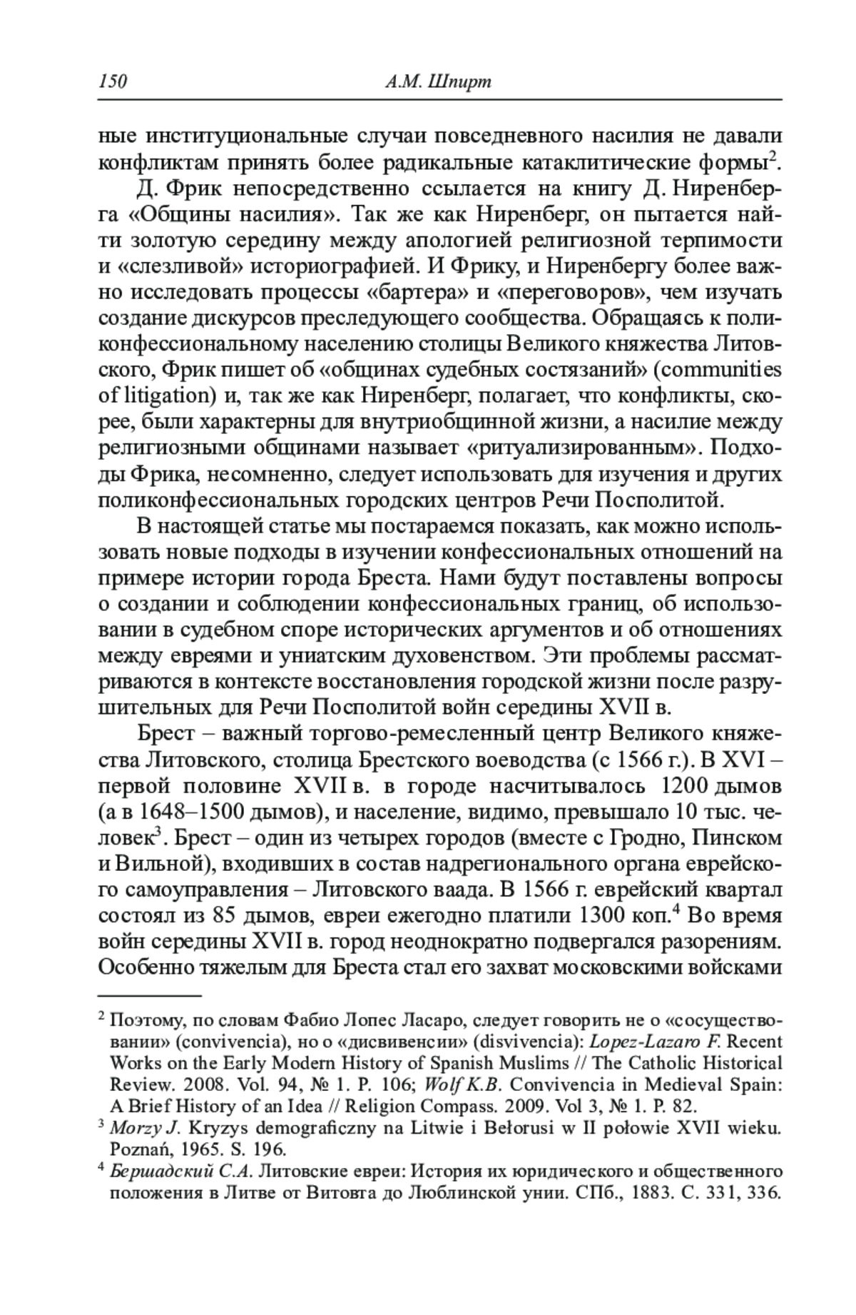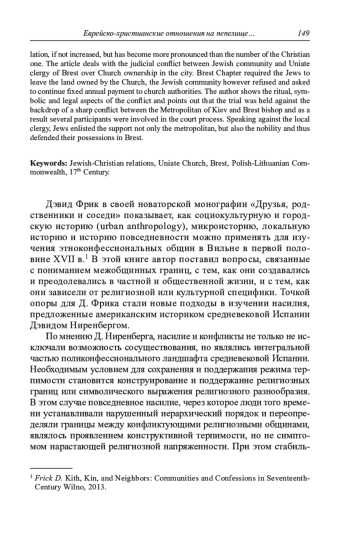 Дэвид Фрик в своей новаторской монографии «Друзья, родственники и соседи» показывает, как социокультурную и городскую историю (urban anthropology), микроисторию, локальную историю и историю повседневности можно применять для изучения этноконфессиональных общин в Вильне в первой половине XVII в. 1 В этой книге автор поставил вопросы, связанные с пониманием межобщинных границ, с тем, как они создавались и преодолевались в частной и общественной жизни, и с тем, как они зависели от религиозной или культурной специфики. Точкой опоры для Д. Фрика стали новые подходы в изучении насилия, предложенные американским историком средневековой Испании Дэвидом Ниренбергом