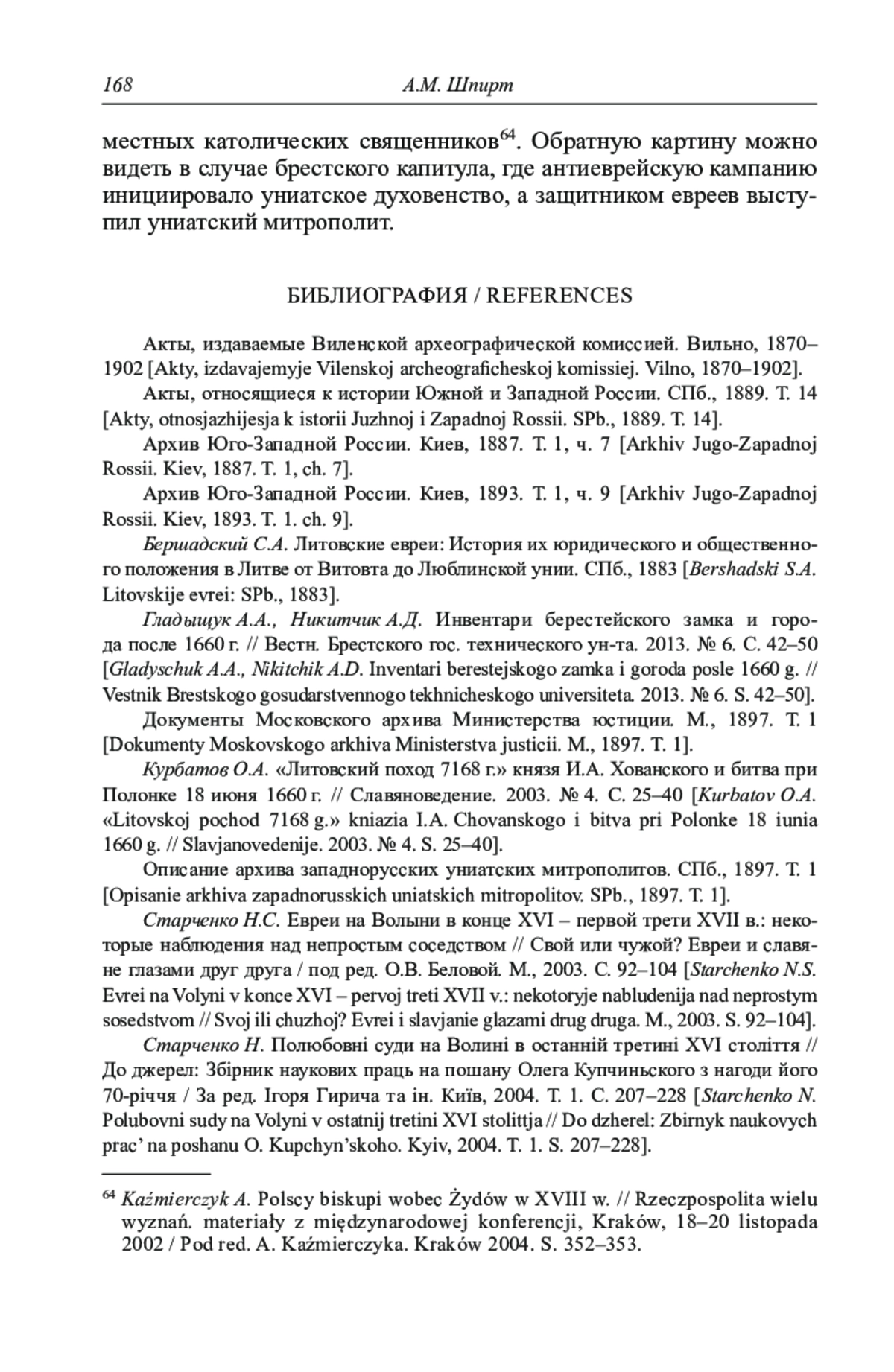 28. 	Kalik J. The Orthodox Church and the Jews in the Polish-Lithuanian Commonwealth // Jewish History. 2003. Vol. 17. P. 229-237. EDN: EQGMIV