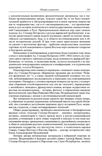 В рецензируемой книге впервые публикуются на русском языке переводы монографии и статей классика русско-скандинавских исследований – Адольфа Стендер-Петерсена, где в комплексе исследуются проблемы историко-культурного взаимодействия Византии, Руси и Скандинавии в IX–XI вв. Этимологии обозначений скандинавов в древнерусских памятниках рассматриваются в широком историко-культурном контексте с учетом эволюции их значений. Рецензент предлагает свою версию происхождения монастыря Рос(ов) на Афоне в свете анализируемой проблематики
