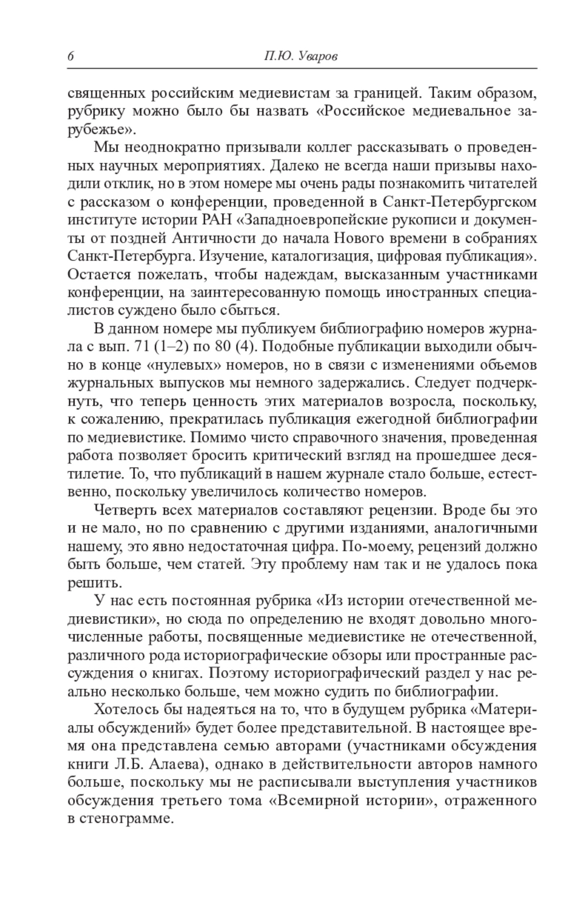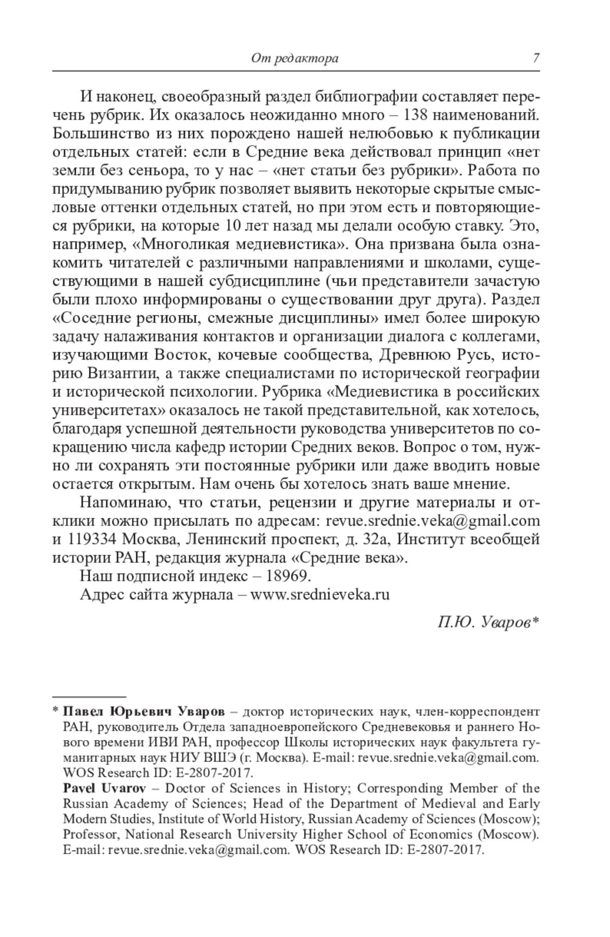 УВАРОВ П. Ю. ОТ РЕДАКТОРА // СРЕДНИЕ ВЕКА. 2020. Т. 81 № 1