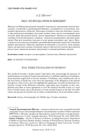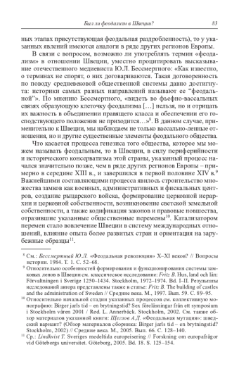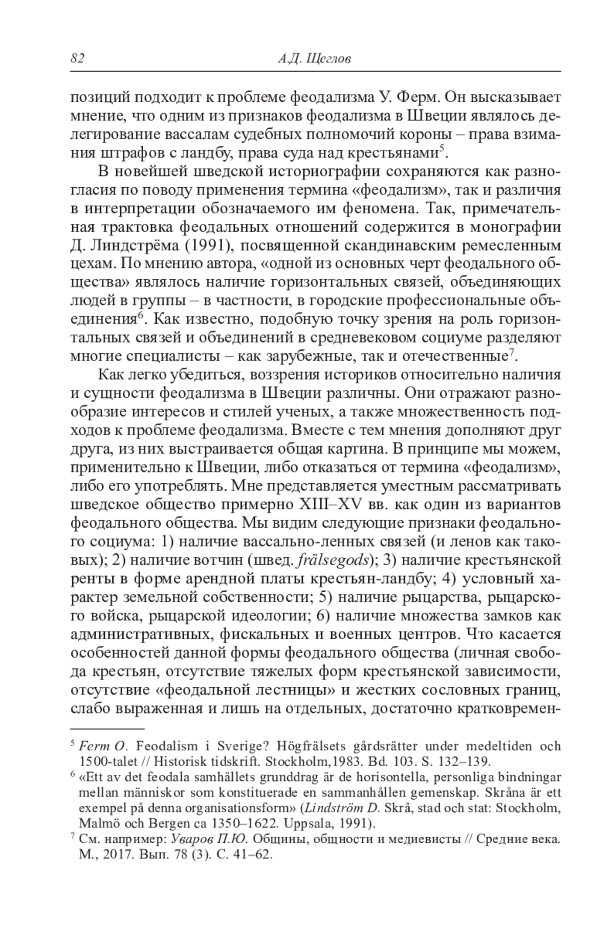 Являлась ли Швеция феодальной страной? Специалисты, признающие наличие феодальных отношений в средневековой Швеции, основываются на различных концепциях феодального общества. Некоторые историки в качестве ключевого элемента феодализма рассматривают вассально-ленные связи, другие подчеркивают роль местных форм феодальной ренты, третьи акцентируют значимость делегирования судебных полномочий короны, четвертые – важность средневековых горизонтальных связей. При всех различиях подходы и точки зрения дополняют друг друга. Представляется уместным рассматривать средневековый шведский социум как локальный вариант феодального общества, принимая во внимание, в частности, такие важные черты, как вассально-ленные отношения, присутствие вотчин, наличие крестьянской ренты и роль замков как военных, фискальных и административных центров