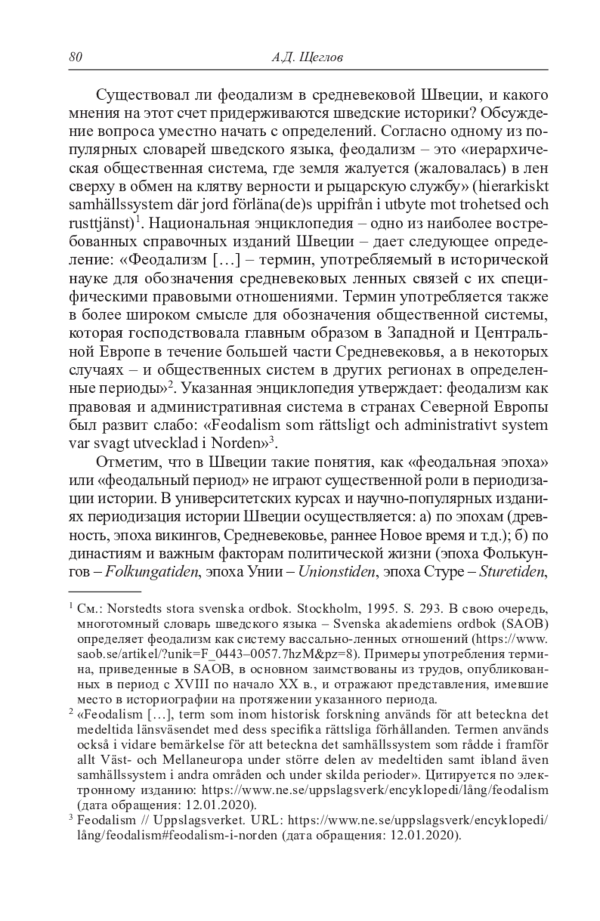 Существовал ли феодализм в средневековой Швеции, и какого мнения на этот счет придерживаются шведские историки? Обсуждение вопроса уместно начать с определений. Согласно одному из популярных словарей шведского языка, феодализм – это «иерархическая общественная система, где земля жалуется (жаловалась) в лен сверху в обмен на клятву верности и рыцарскую службу» (hierarkiskt samhällssystem där jord förläna(de)s uppifrån i utbyte mot trohetsed och rusttjänst) 1. Национальная энциклопедия – одно из наиболее востребованных справочных изданий Швеции – дает следующее определение: «Феодализм […] – термин, употребляемый в исторической науке для обозначения средневековых ленных связей с их специфическими правовыми отношениями.