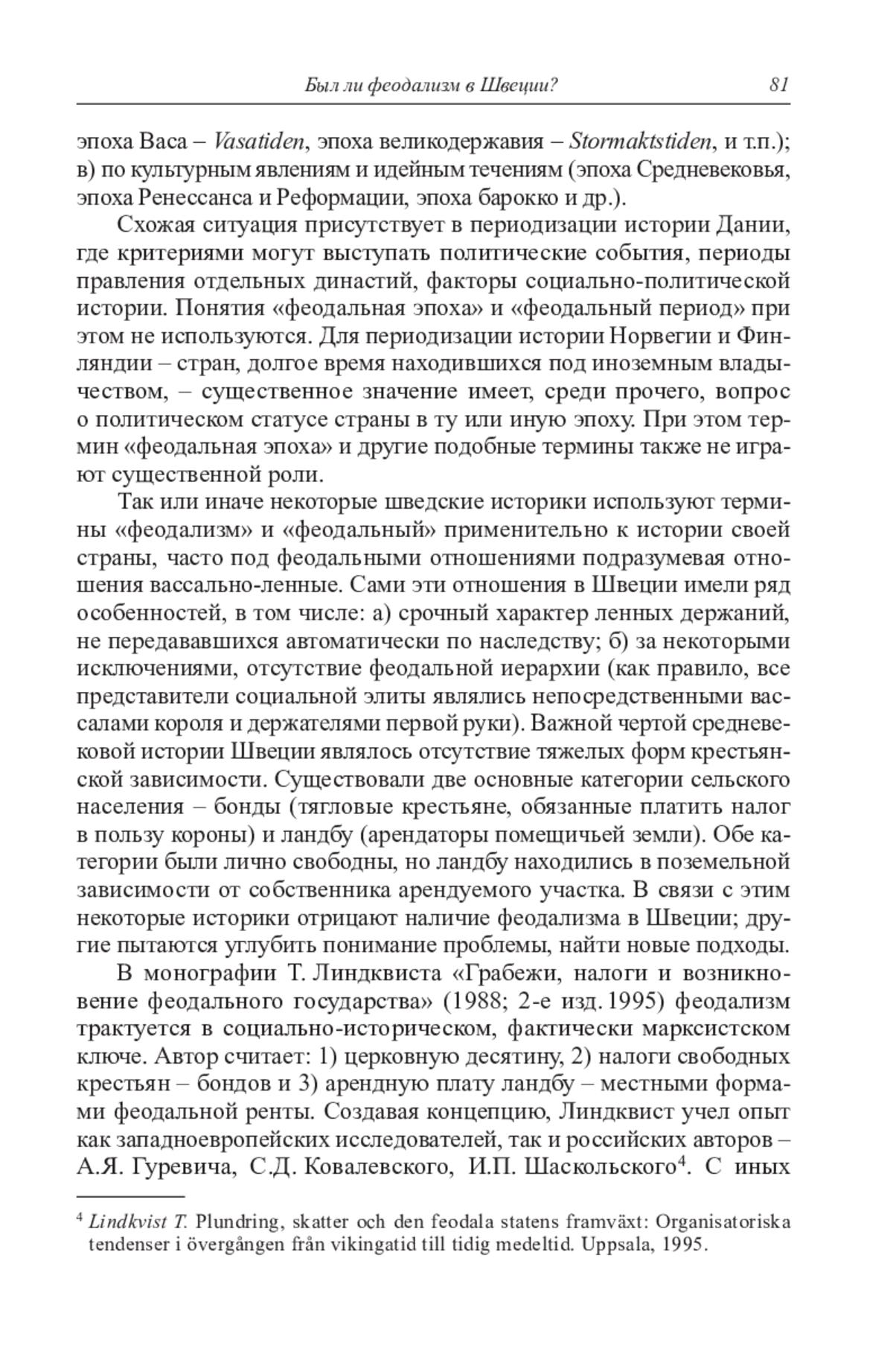 8. 	Lindkvist Т. Plundring, shatter och den feodala statens framvaxt: Organisatoriska tendenser i oveigangen fran vikingatid till tidig medeltid. Uppsala, 1995.