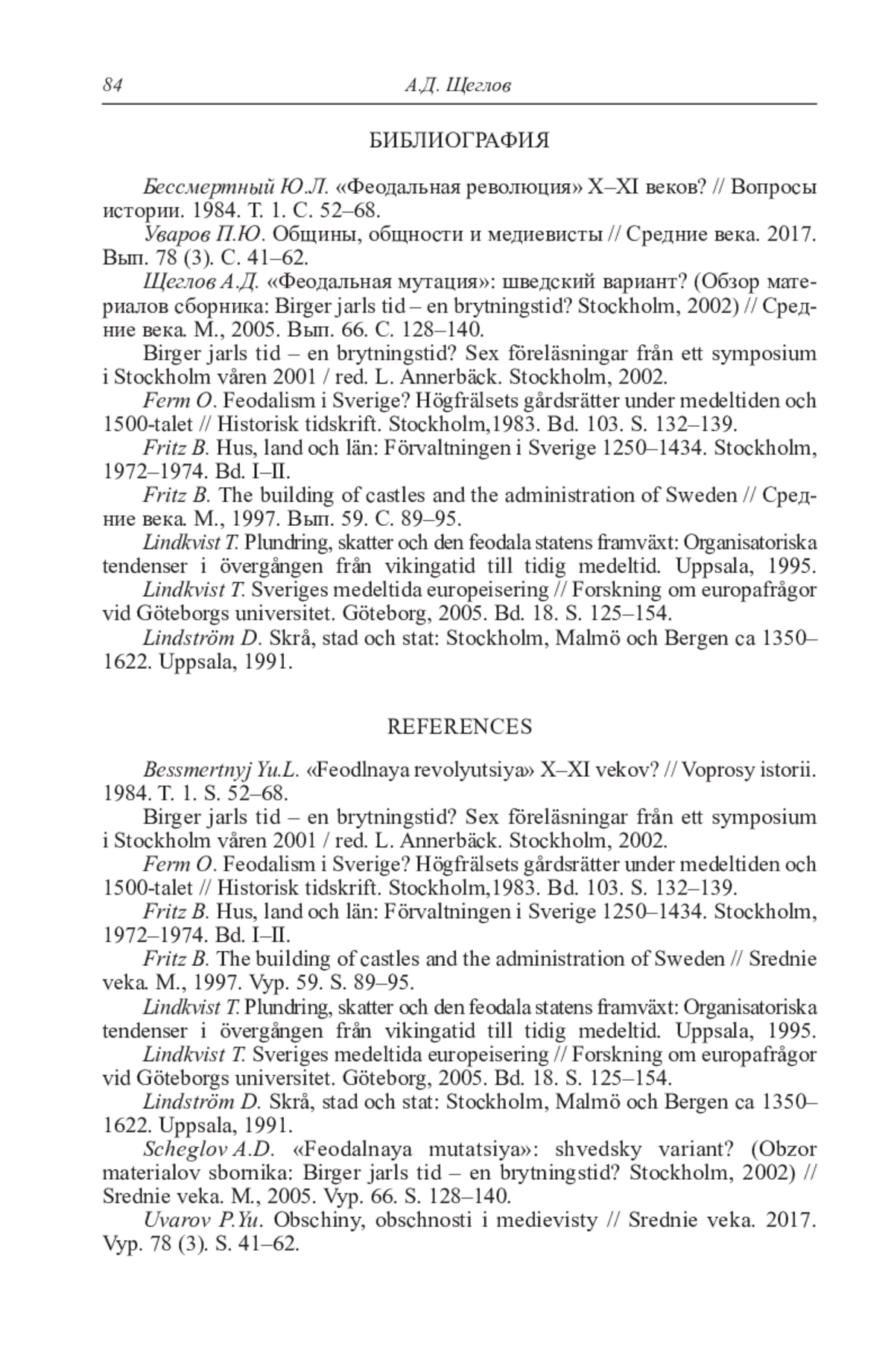 3. 	Щеглов А.Д. “Феодальная мутация”: шведский вариант? (Обзор материалов сборника: Birger jarls tid - enbrytningstid? Stockholm, 2002) // Средние века. M, 2005. Вып. 66. С. 128-140.