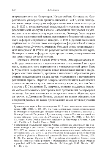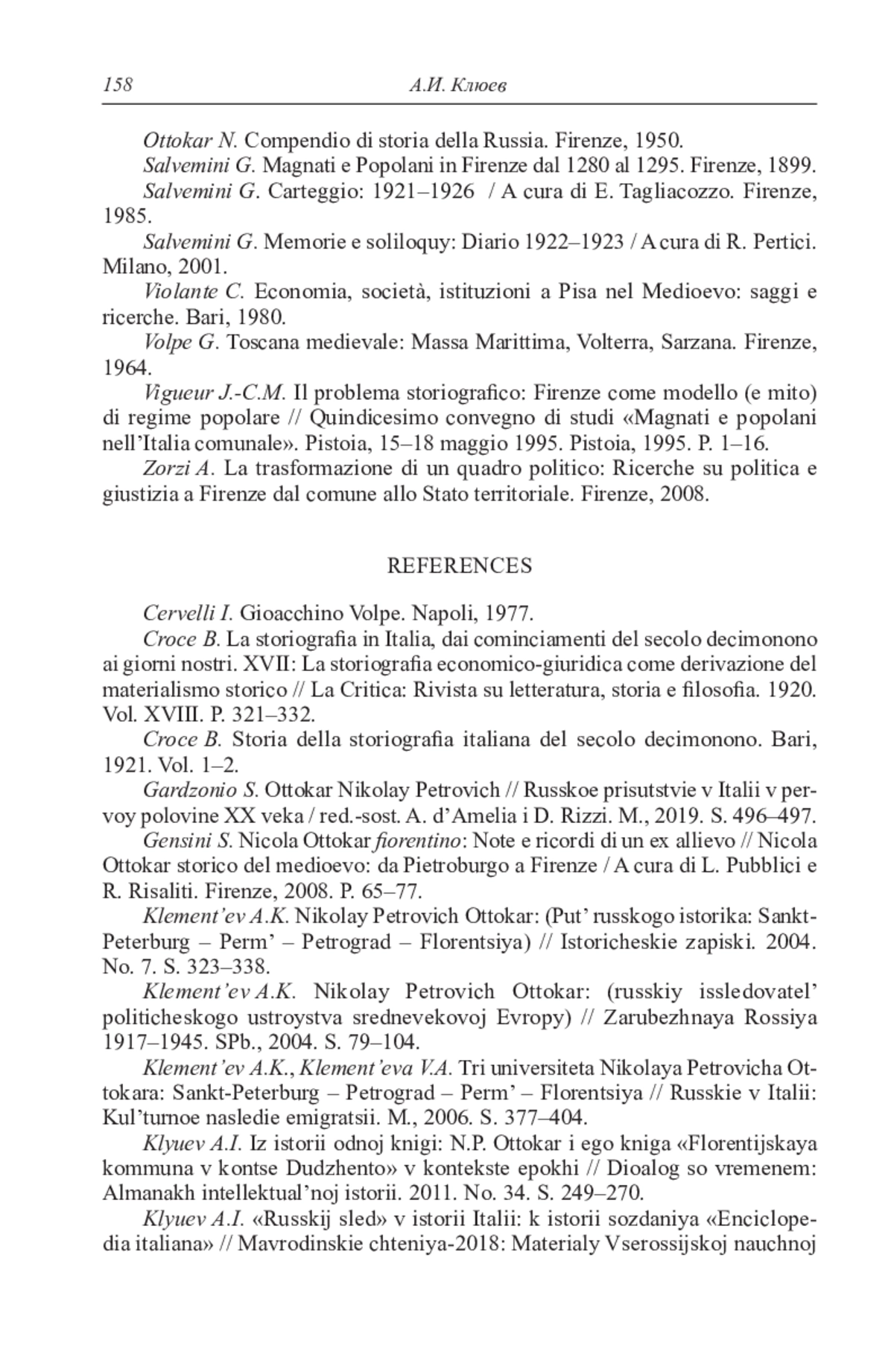 6. 	Клюев А.II. Из истории одной книги: Н.П. Оттокар и его книга “Флорентийская коммуна в конце Дудженто” в контексте эпохи // Диалог со временем: Альманах интеллектуальной истории. 2011. № 34. С. 249-270. EDN: OJWRUR