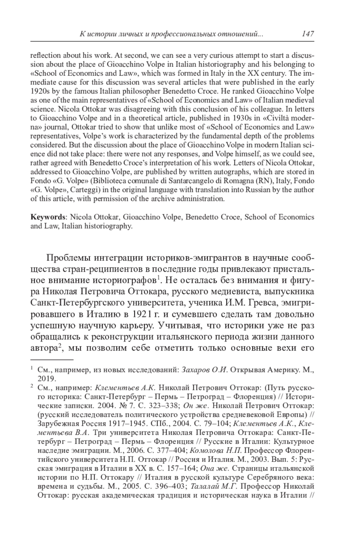 Проблемы интеграции историков-эмигрантов в научные сообщества стран-реципиентов в последние годы привлекают пристальное внимание историографов 1. Не осталась без внимания и фигура Николая Петровича Оттокара, русского медиевиста, выпускника Санкт-Петербургского университета, ученика И. М. Гревса, эмигрировавшего в Италию в 1921 г. и сумевшего сделать там довольно успешную научную карьеру.