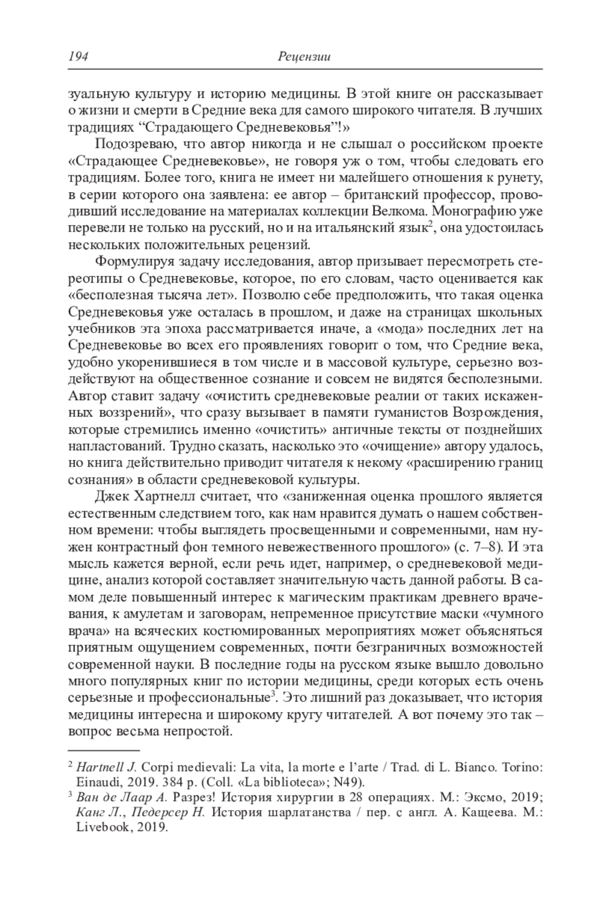 Рецензия на русское издание монографии английского исследователя Джека Хартнелла (Hartnell J. Medieval Bodies: Life, Death and Art in the Middle Ages. London: Wellcome Collection, 2018). Анализируется структура работы, особое внимание уделено качеству русского перевода и ошибкам, допущенным издателями