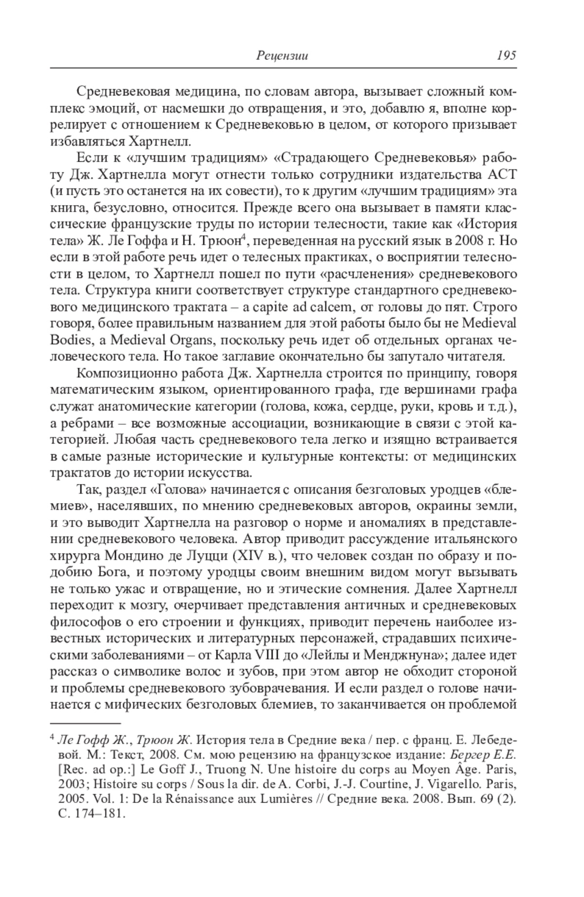 1. Бергер Е.Е. [Rec. ad op.:] Le Goff J., Truong N. Une histoire du corps au Moyen Age. Paris, 2003; Histoire du corps / Sous la dir. de A. Corbi, J. -J. Courtine, J. Vigarello. Paris, 2005. Vol. 1: De la Renaissance aux Lumieres // Средние века. 2008. Вып. 69(2). С. 174-181. EDN: MUEAFX