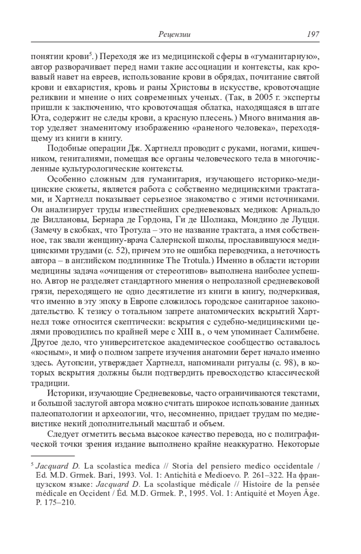 В серии «Искусство и наука рунета», созданной издательством АСТ, в 2019 г. вышел русский перевод монографиии Джека Хартнелла. Английское заглавие «Medieval Bodies»1 было переведено на русский язык как «Голое Средневековье». Такое пошлое и глупое название, совершенно не соответствующее содержанию, может сыграть с книгой дурную шутку: оно бы украсило обложку любого таблоида, а у серьезного читателя вызывает скорее отторжение; любители же «легкого чтения» ее явно не осилят. Таким образом, книга теряет потенциального читателя, и это весьма печально, потому что Джек Хартнелл, профессор Норвичского университета, написал очень хорошую и серьезную работу.