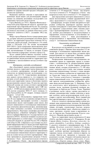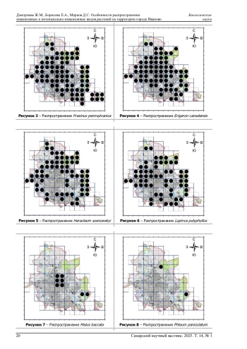 В статье обсуждаются проблемы инвазионных видов растений в областном центре Ивановской области - в г. Иваново. Всего к 2024 г. в г. Иваново было отмечено 112 инвазионных и потенциально инвазионных видов растений. Приведены результаты изучения особенностей распространения инвазионных и потенциально инвазионных видов растений по территории города, выявленные на основе метода сеточного картирования. Для оценки общего распространения применялась разработанная авторами 4-балльная шкала. Установлено, что по территории города инвазионные и потенциально инвазионные виды распространены неравномерно. К группе широко распространенных видов, которые встречаются в 71-100 квадратах относятся всего 4 вида ( Acernegundo, Amelanchier spicata, Erigeron canadensis, Fraxinus pennsylvanica ). 43 вида встречаются часто (в 31-70 квадратах), 38 видов - изредка (в 11-30 квадратах), 27 видов - редко (в 1-10 квадратах). Проведен анализ инвазионных видов в соответствии с их инвазионным статусом. Выявлены наиболее опасные для экосистем города инвазионные виды, которые отнесенные к трансформерам (всего 9 видов). Приводятся примеры и картосхемы распространения инвазионных видов каждой группы.