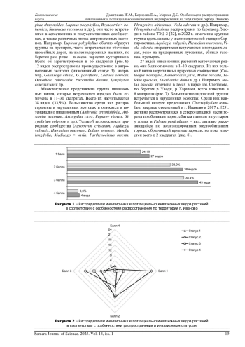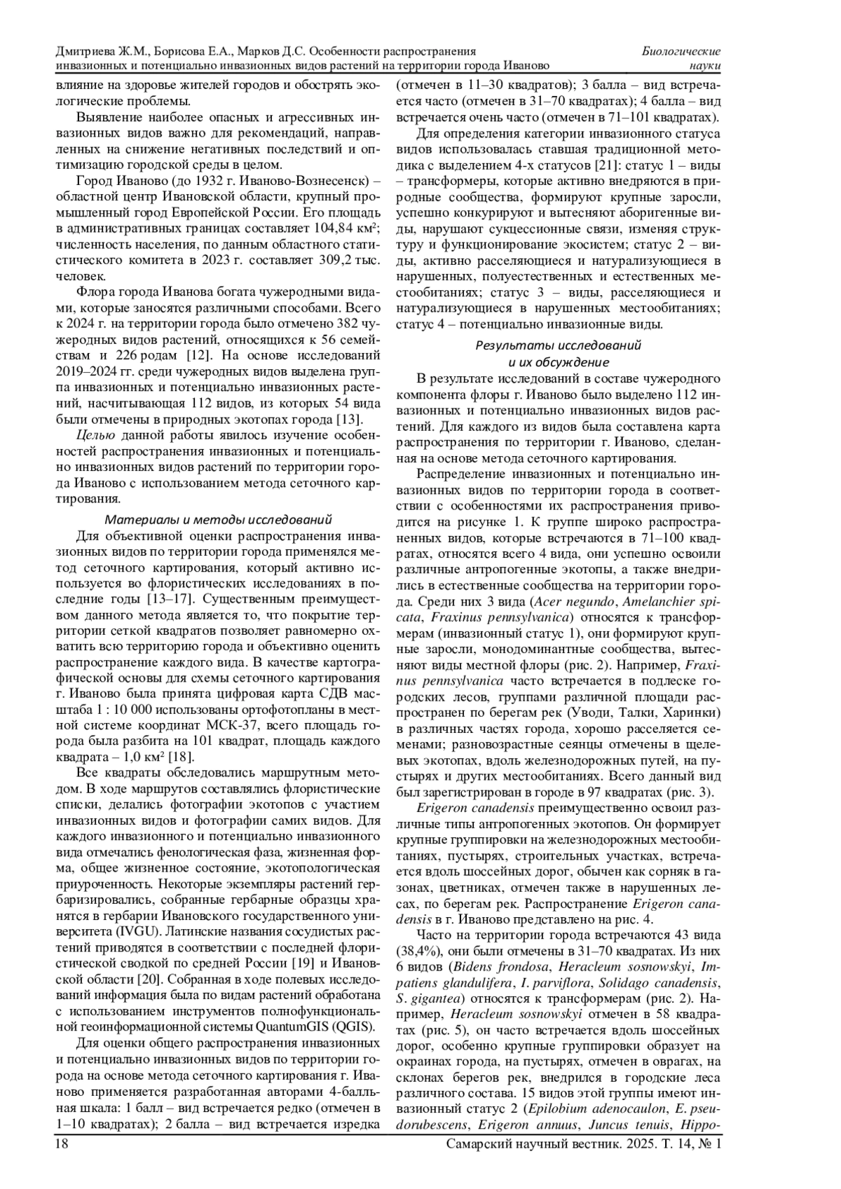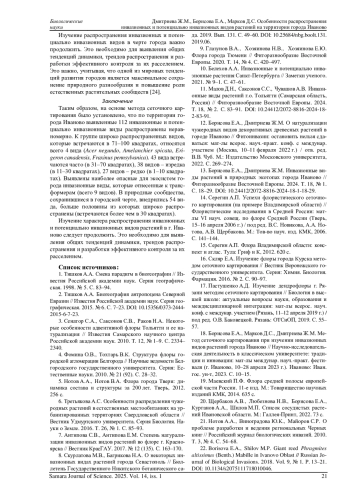 13. Борисова Е.А., Дмитриева Ж.М. Инвазионные виды растений в природных экотопах города Иваново // Фиторазнообразие Восточной Европы. 2024. Т. 18, № 1. С. 18-29. DOI: 10.24412/2072-8816-2024-18-1-18-29 EDN: JKYIEP