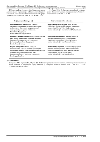 23. Борисова Е.А., Курганов А.А. Сведения о нахождении новых и редких видов в Ивановской области // Бюллетень Московского общества испытателей природы. Отдел биологический. 2019. Т. 124, № 3. С. 32-35. EDN: VYWNJX