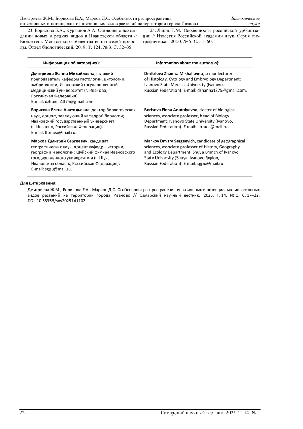 12. Борисова Е.А., Дмитриева Ж.М. О натурализации чужеродных видов декоративных древесных растений в городе Иваново // Фитоинвазии: остановить нельзя сдаваться: мат-лы всерос. науч.-практ. конф. с междунар. участием (Москва, 10-11 февраля 2022 г.) / отв. ред. В.В. Чуб. М.: Издательство Московского университета, 2022. С. 269-274. EDN: FDBKKJ