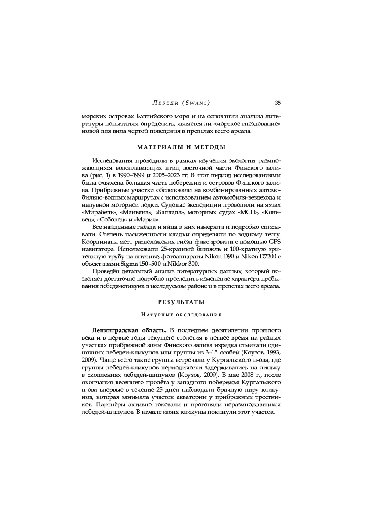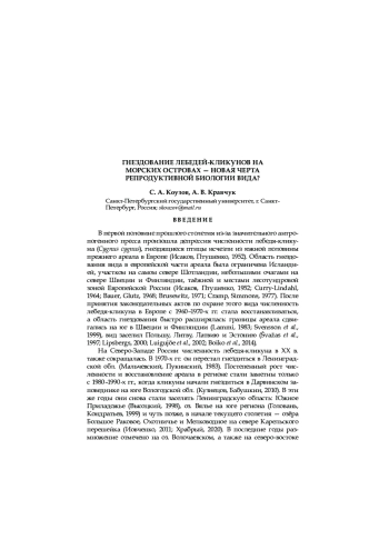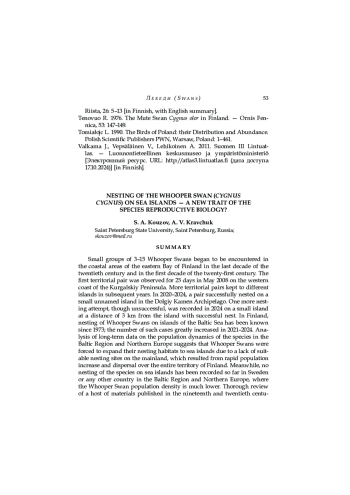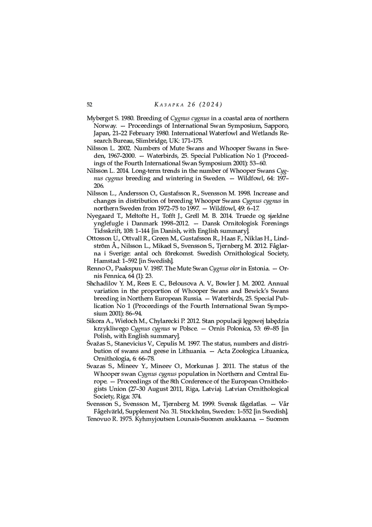 86. 	Kouzov S. A., Kravchuk A. V., Abakumov E. V. 2024a. Whooper swans Cygnus cygnus nesting on offshore islands - a new or a well-forgotten old? - Wildfowl, 74: 3-22.