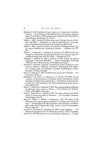 96. 	Nilsson L., Andersson O., Gustafsson R., Svensson M. 1998. Increase and changes in distribution of breeding Whooper Swans Cygnus cygnus in northern Sweden from 1972-75 to 1997. - Wildfowl, 49: 6-17.