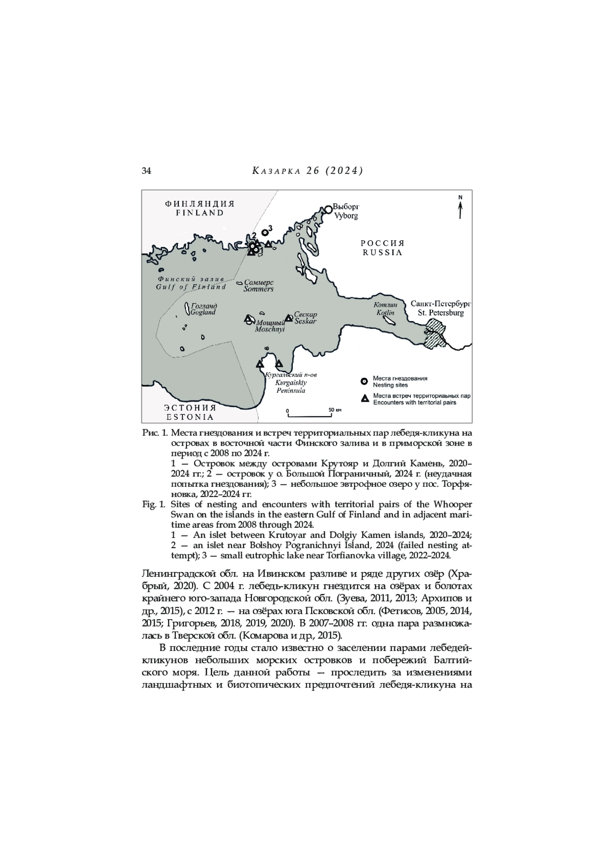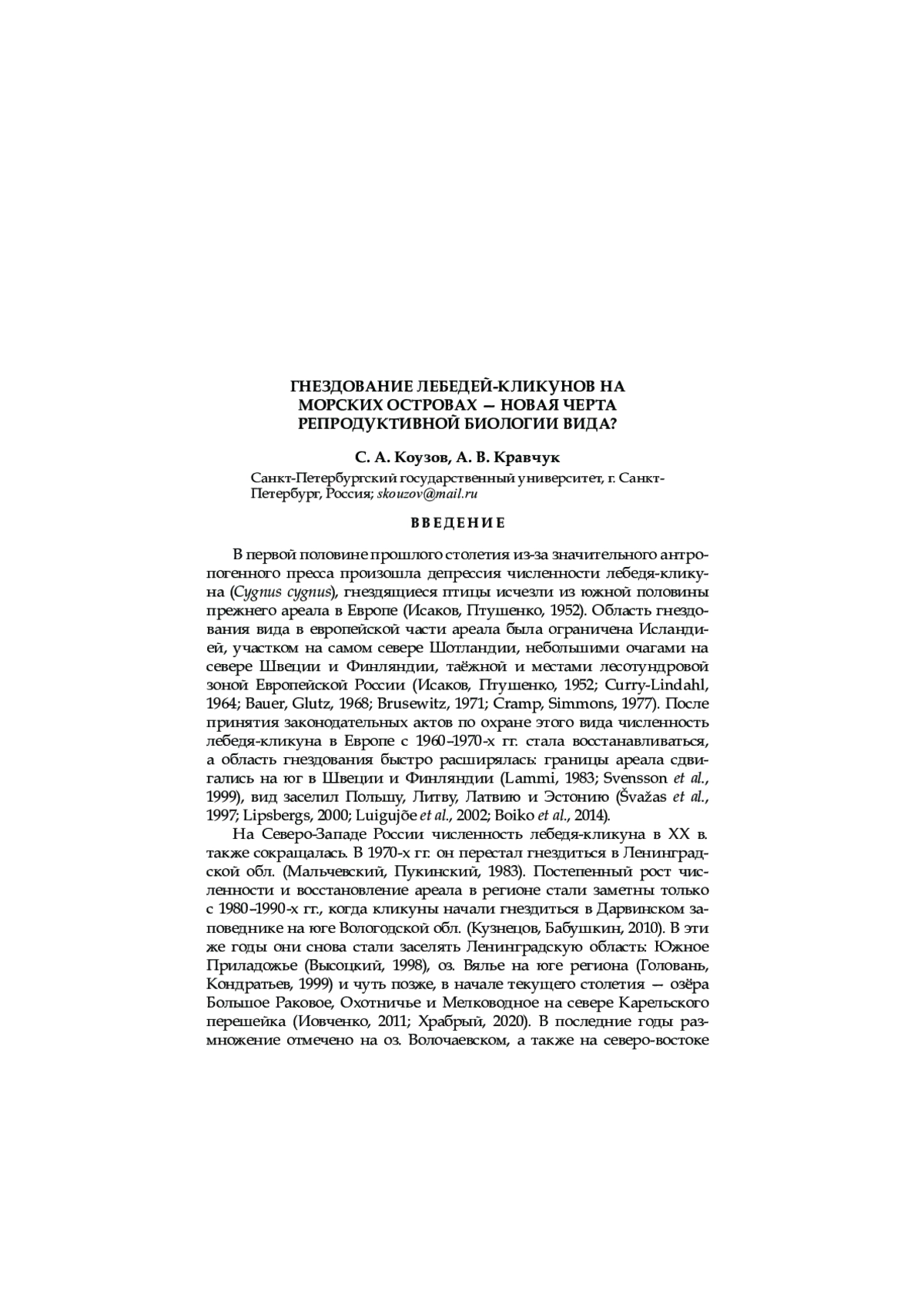 29. 	Коузов С. А., Кравчук А. В. 2023. Дополнения к материалам по гнездованию лебедя-кликуна Cygnus cygnus на островах восточной части Финского залива в 2020-2022 годах. - Русский орнитологический журнал, 32 (2344): 4110-4118.