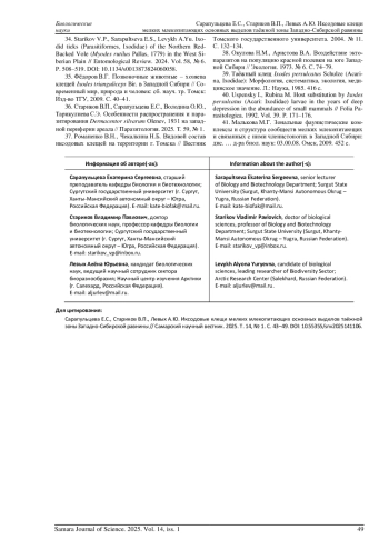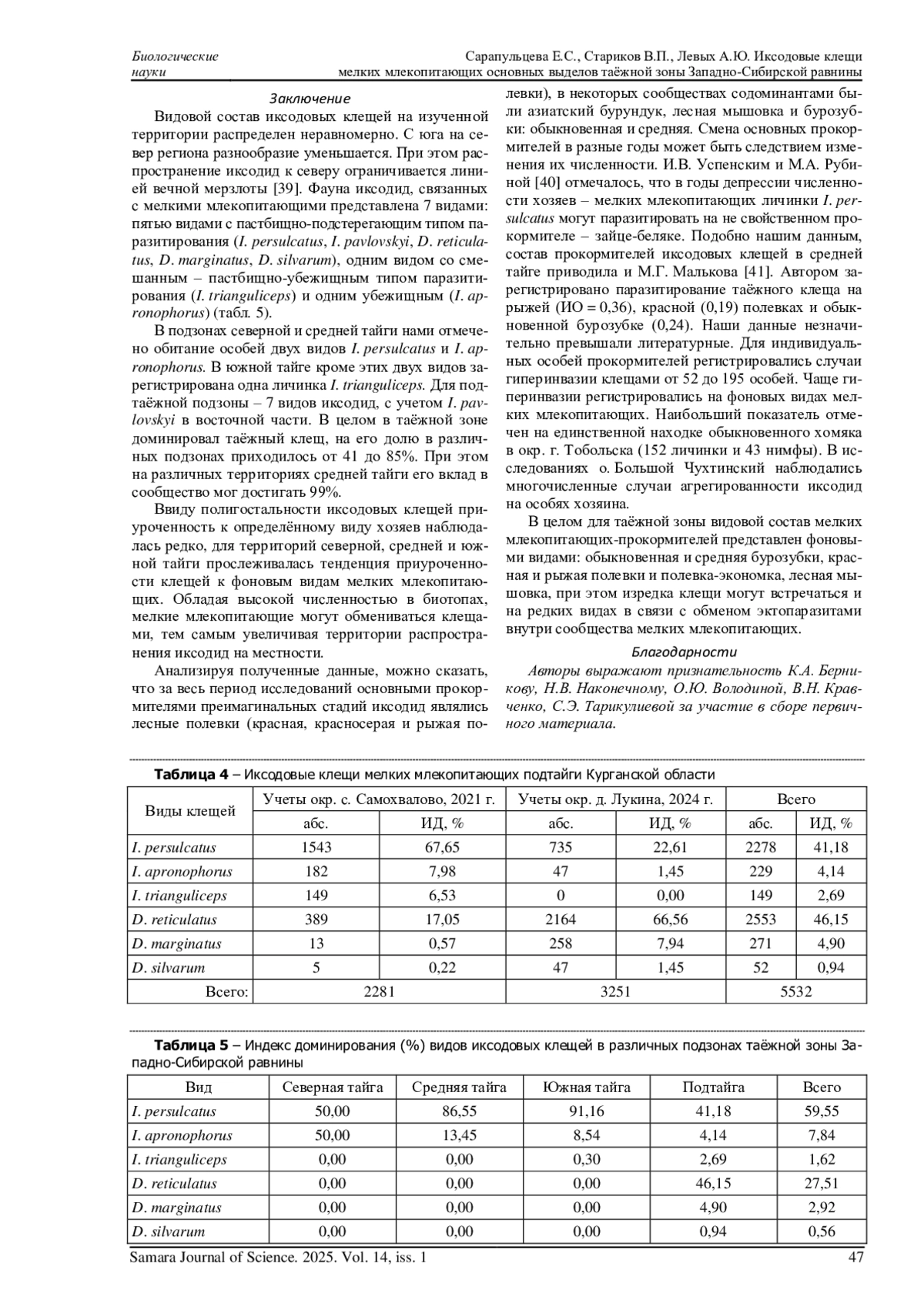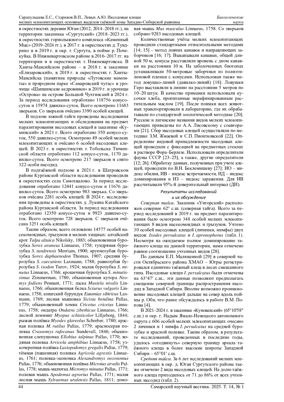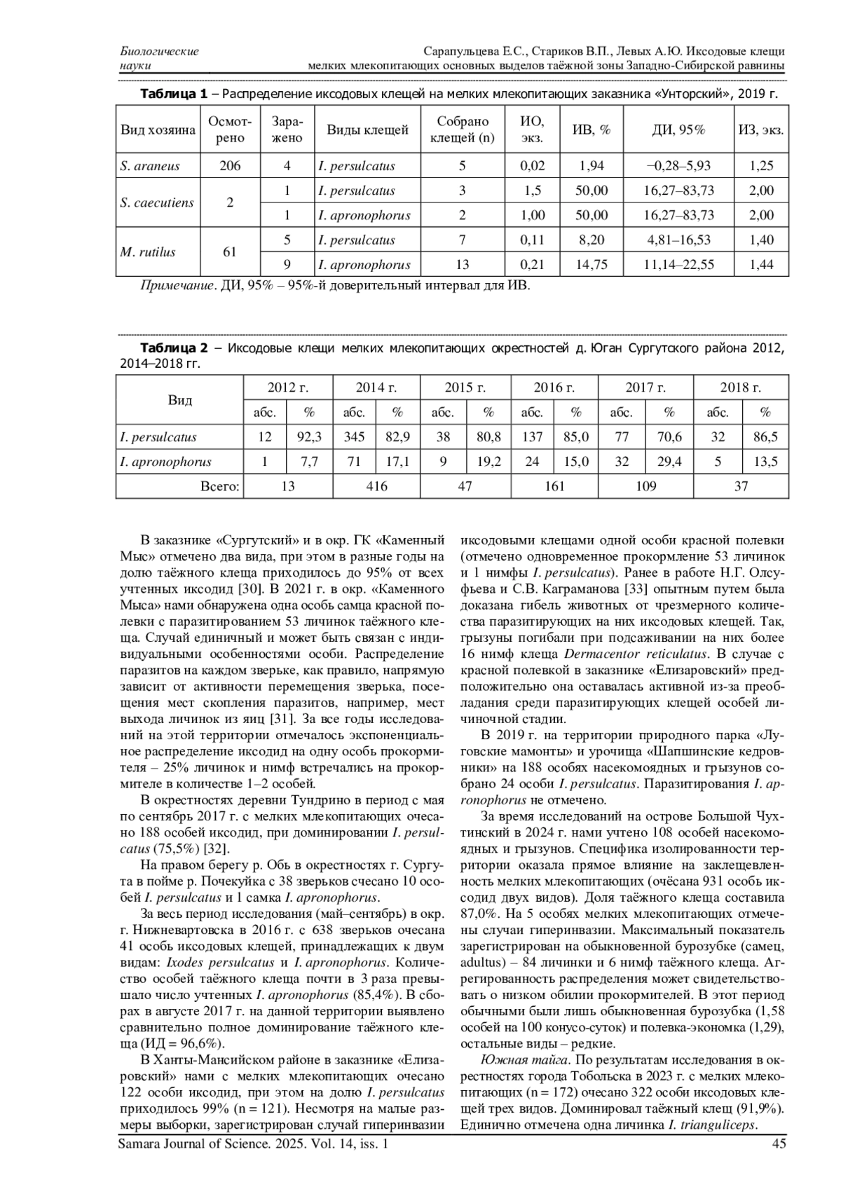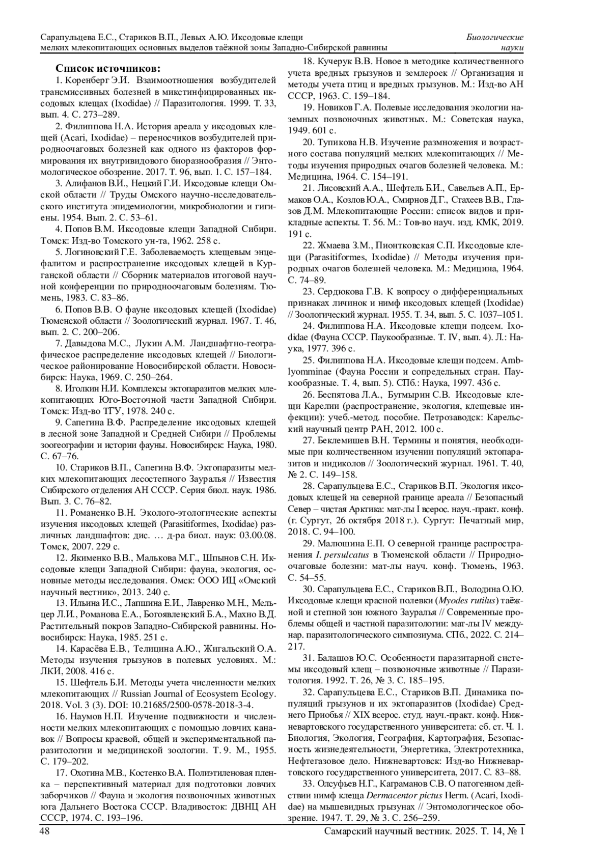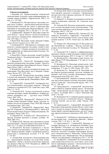 34. 	Starikov V.P., Sarapultseva E.S., Levykh A.Yu. Ixodid ticks (Parasitiformes, Ixodidae) of the Northern Red-Backed Vole (Myodes rutilus Pallas, 1779) in the West Siberian Plain // Entomological Review. 2024. Vol. 58, № 6. P. 508-519. DOI: 10.1134/s0013873824060058 EDN: ZSDPMO