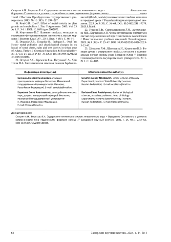1. 	Уромова И.П., Штырлина О.В., Дедюра И.С. Влияние антропогенных факторов на содержание фотосинтетических пигментов в листьях древесных растений в городских условиях // Journal of Agriculture and Environment. 2023. № 12 (40). DOI: 10.23649/jae.2023.40.15