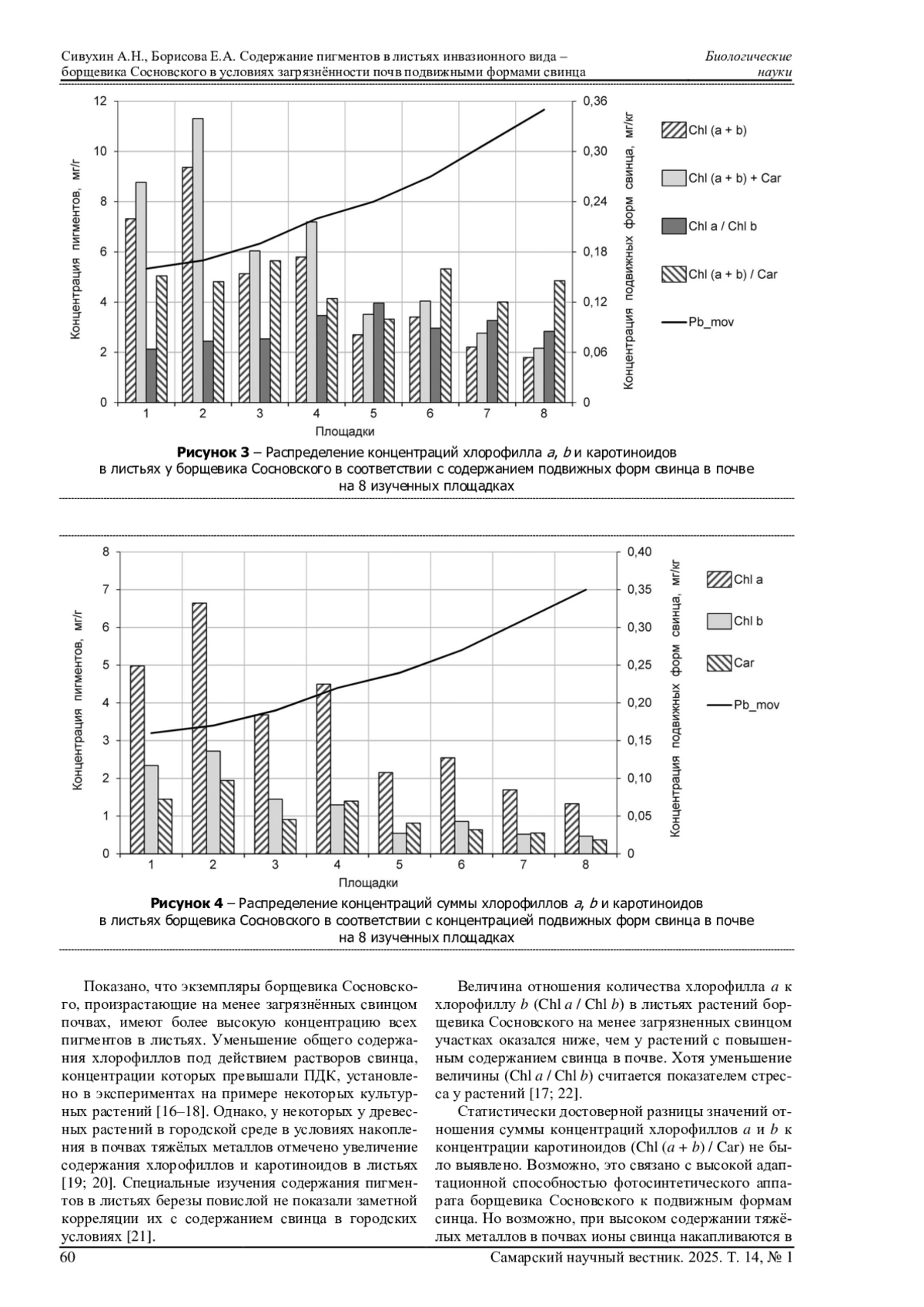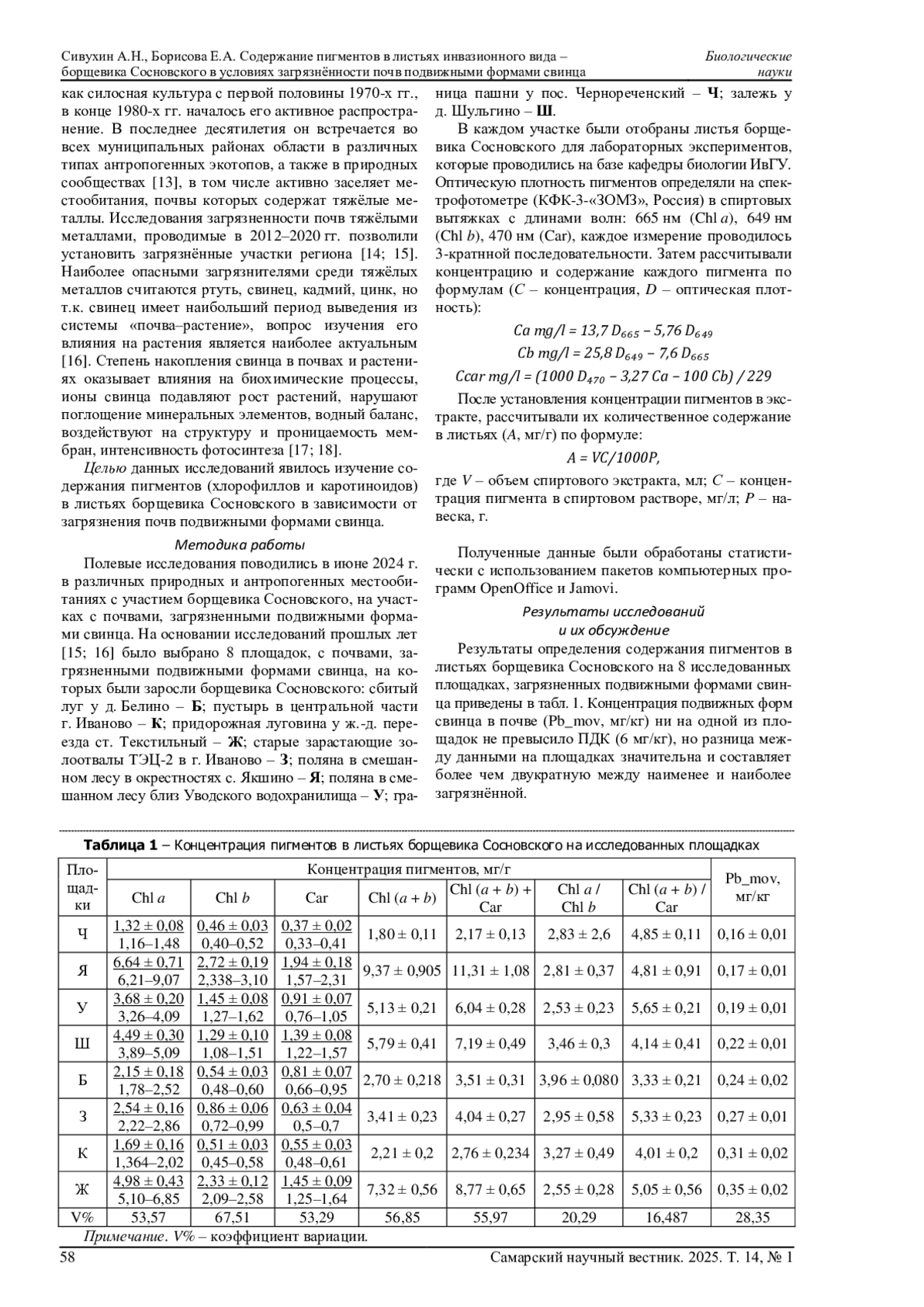 Статья посвящена изучению фотосинтетических пигментов в листьях инвазивного вида - борщевика Сосновского ( Heracleum sosnowskyi Manden.). Приводятся данные о содержании хлорофиллов (Chl a и Chl b ), а также каротиноидов (Car) в листьях борщевика Сосновского в экотопах с разной степенью загрязнённости почвы подвижными формами свинца на территории Ивановской области. В результате анализа полученных данных было установлено, что концентрация пигментов в листьях борщевика Сосновского варьирует в широком диапазоне (концентрация Chl a - от 1,32 до 6,98 мг/г; концентрация Chl b - от 0,46 до 2,72 мг/г, концентрация каротиноидов - от 0,37 до 1,45 мг/г). Содержание хлорофиллов и каротиноидов в листьях борщевика в целом снижается при увеличении концентрации подвижных форм свинца в почве, а величина соотношения количества Chl a / Chl b повышается. Величина соотношения суммы хлорофиллов (Chl a + Chl b ) к содержанию каротиноидов (Car) остаётся стабильной. Полученные материалы могут служить основой для дальнейшего изучения пигментов фотосинтетического аппарата инвазионного растения - борщевика Сосновского в условиях разной степени антропогенного воздействия на территории Ивановской области и смежных регионов.