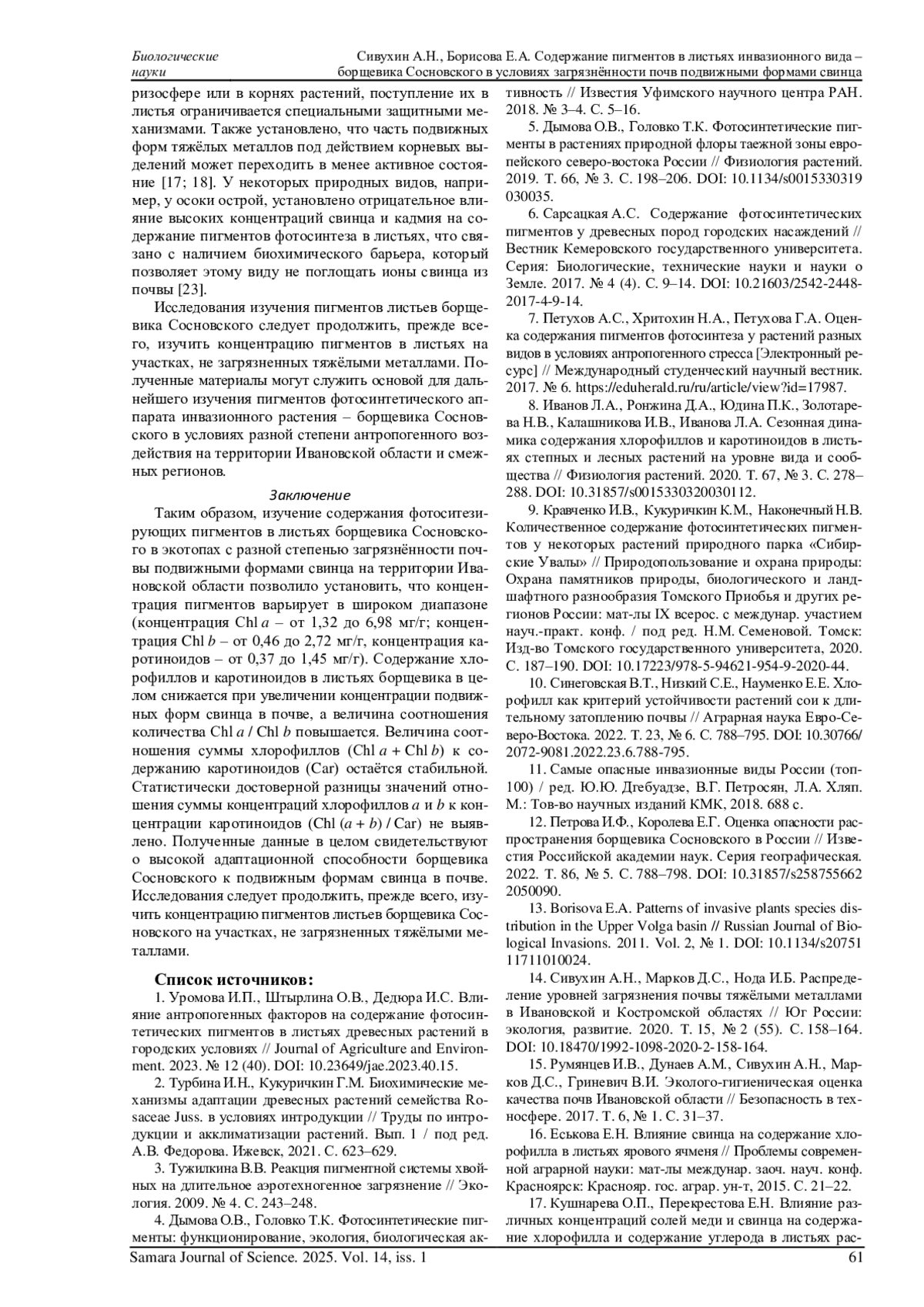 6. 	Сарсацкая А.С. Содержание фотосинтетических пигментов у древесных пород городских насаждений // Вестник Кемеровского государственного университета. Серия: Биологические, технические науки и науки о Земле. 2017. № 4 (4). С. 9-14. DOI: 10.21603/2542-2448-2017-4-9-14 EDN: YNHHMW
