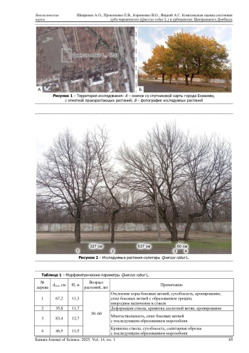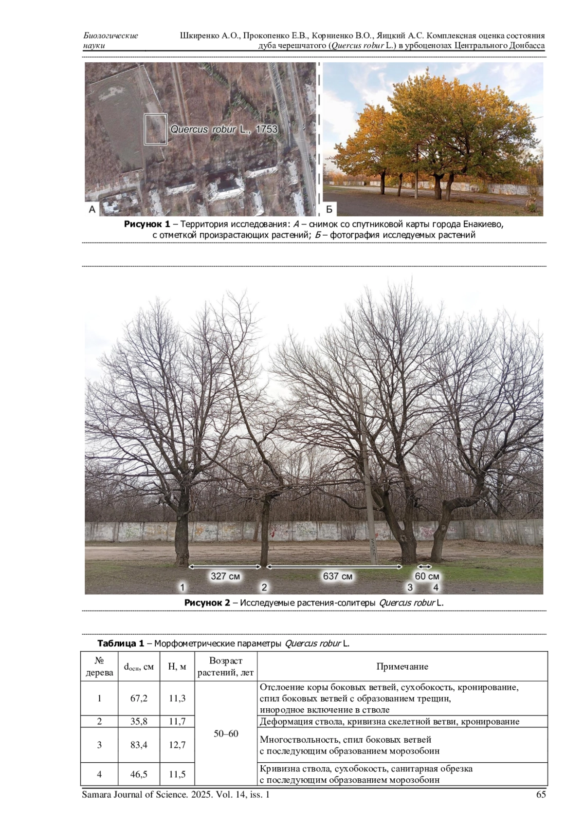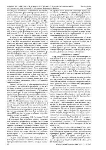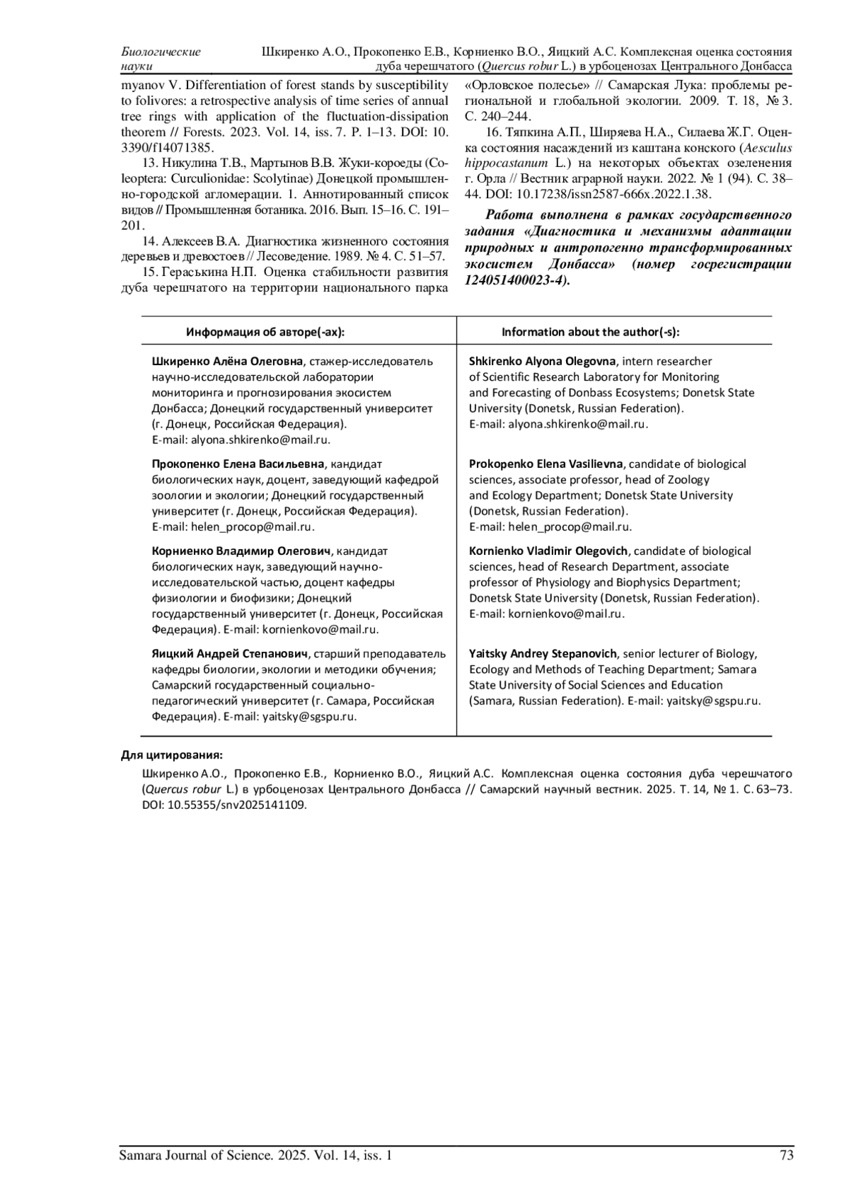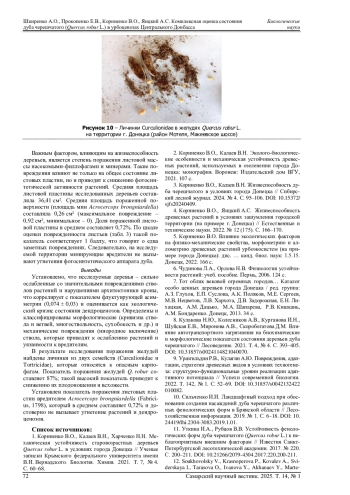3. 	Корниенко В.О., Калаев В.Н. Жизнеспособность дуба черешчатого в условиях города Донецка // Сибирский лесной журнал. 2024. № 4. С. 95-106. DOI: 10.15372/sjfs20240409 EDN: SPLUNB