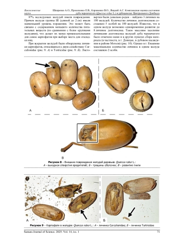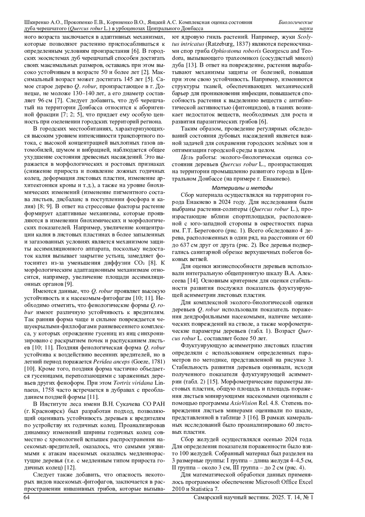 В условиях современного Донбасса, при уже существовавших ранее негативных факторах техногенной нагрузки в условиях промышленного региона, а также наслоении новых антропогенных вызовов, встает ряд проблем, связанных со стабильностью и развитием биологических систем. Устойчивость дендроценозов и непосредственно программа выживания рассматривается как соотношение между величиной стрессирующего воздействия и степенью полученного повреждения для различных её компонентов (организмов, популяций, сообществ). В работе представлена комплексная эколого-биологическая оценка состояния деревьев Quercus robur L., произрастающих на территории г. Енакиево, на основе дендрологических и энтомологических исследований. Деревья, сильно ослабленные со значительными повреждениями стволов растений и нарушениями архитектоники кроны, что коррелирует с показателем флуктуирующей асимметрии листовых пластин (0,074 ± 0,03) и оценивается как экологический кризис состояния дендроценозов. Определены морфологические и механические повреждения ствола (кривизна, многоствольность, сухобокость и инородные включения), дана их классификация. Выявленные пороки достоверно приводят к ослаблению и повышению уязвимости деревьев к воздействию дендрофильных насекомых. По результатам исследования желудей установлен высокий показатель поражения - 87%, что негативно сказывается на плодоношении и всхожести проростков. Также найдены личинки карпофагов из двух семейств (Curculionidae и Tortricidae). Поражение листовых пластин вредителем Acrocercops brongniardella (Fabricius, 1798) составляет в среднем 0,72%. Такой показатель достоверно не отражался на состоянии древостоев.