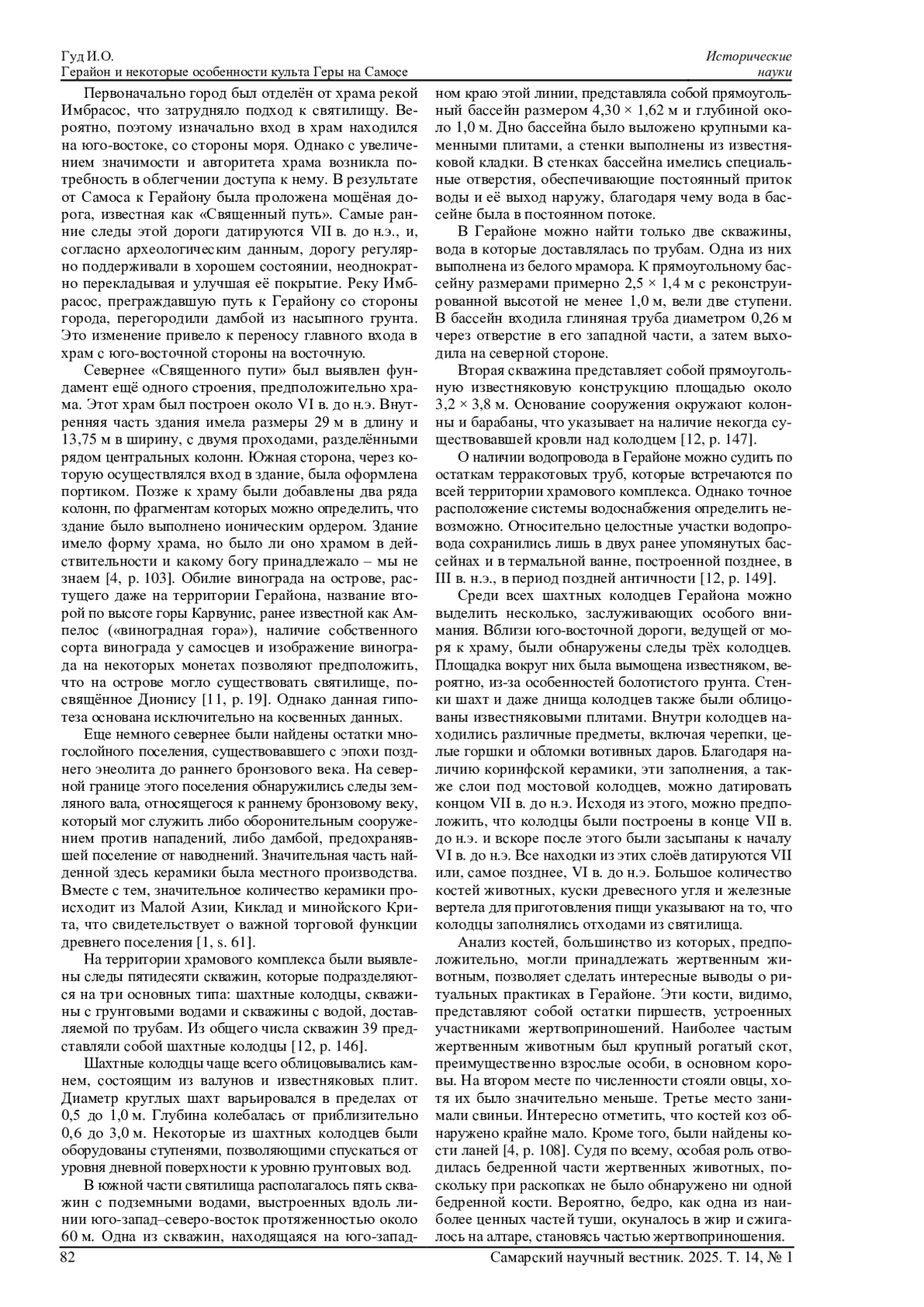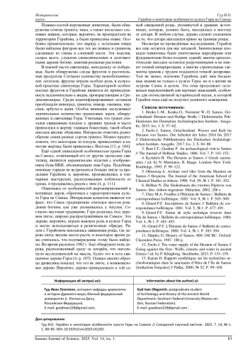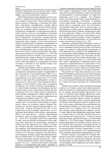 Настоящая работа посвящена исследованию храма Геры на острове Самос, который является одним из важнейших памятников античной архитектуры. В статье рассматриваются этапы строительства и реконструкции храма, начиная с VIII в. до н. э. Подробно освещаются архитектурные особенности каждого этапа, а также проблемы, возникшие в процессе строительства, такие как перегрузка грунта и необходимость частичных перестроек. Также рассмотрена структура храмового комплекса, включающего различные культовые и хозяйственные постройки, расположенные вокруг главного храма. Особое внимание уделено роли Священного пути, соединяющего город Самос с храмовым комплексом, и влиянию изменений ландшафта на доступность святилища. Отдельное внимание уделяется ритуалам и артефактам, связанным с культом Геры. Обнаружены остатки жертвенных животных, фруктов и семян, а также уникальные керамические изделия, связанные с культом Геры. Рассматриваются и некоторые другие особенности религиозной жизни на острове Самос, такие как связь дерева лигос с богиней Герой, считавшейся покровительницей острова. Особое внимание уделяется символам плодородия, которые играли значительную роль в культе Геры.