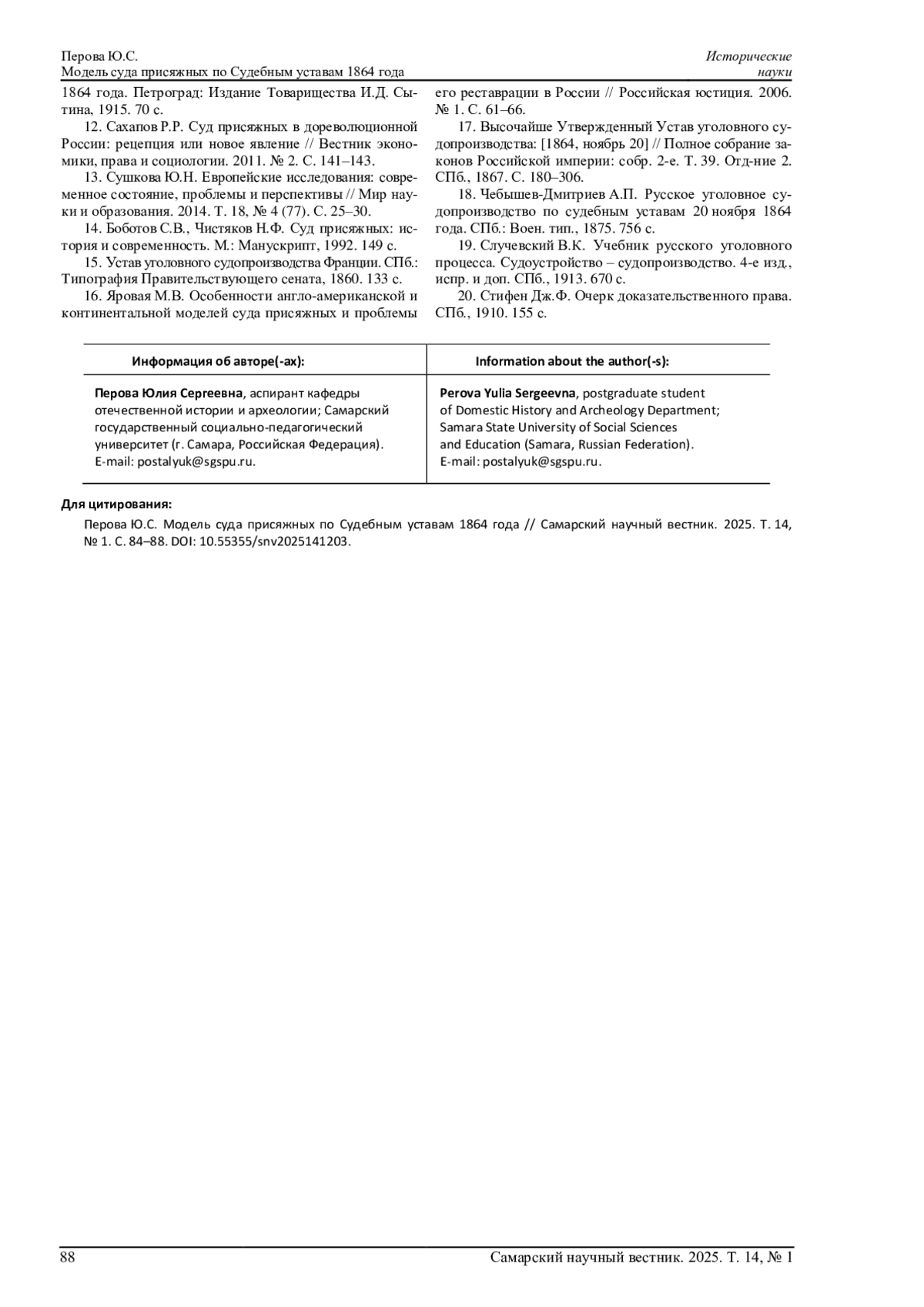 12. 	Сахапов Р.Р. Суд присяжных в дореволюционной России: рецепция или новое явление // Вестник экономики, права и социологии. 2011. № 2. С. 141-143. EDN: NVYLHD