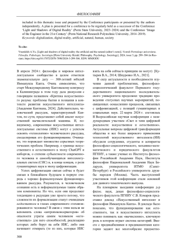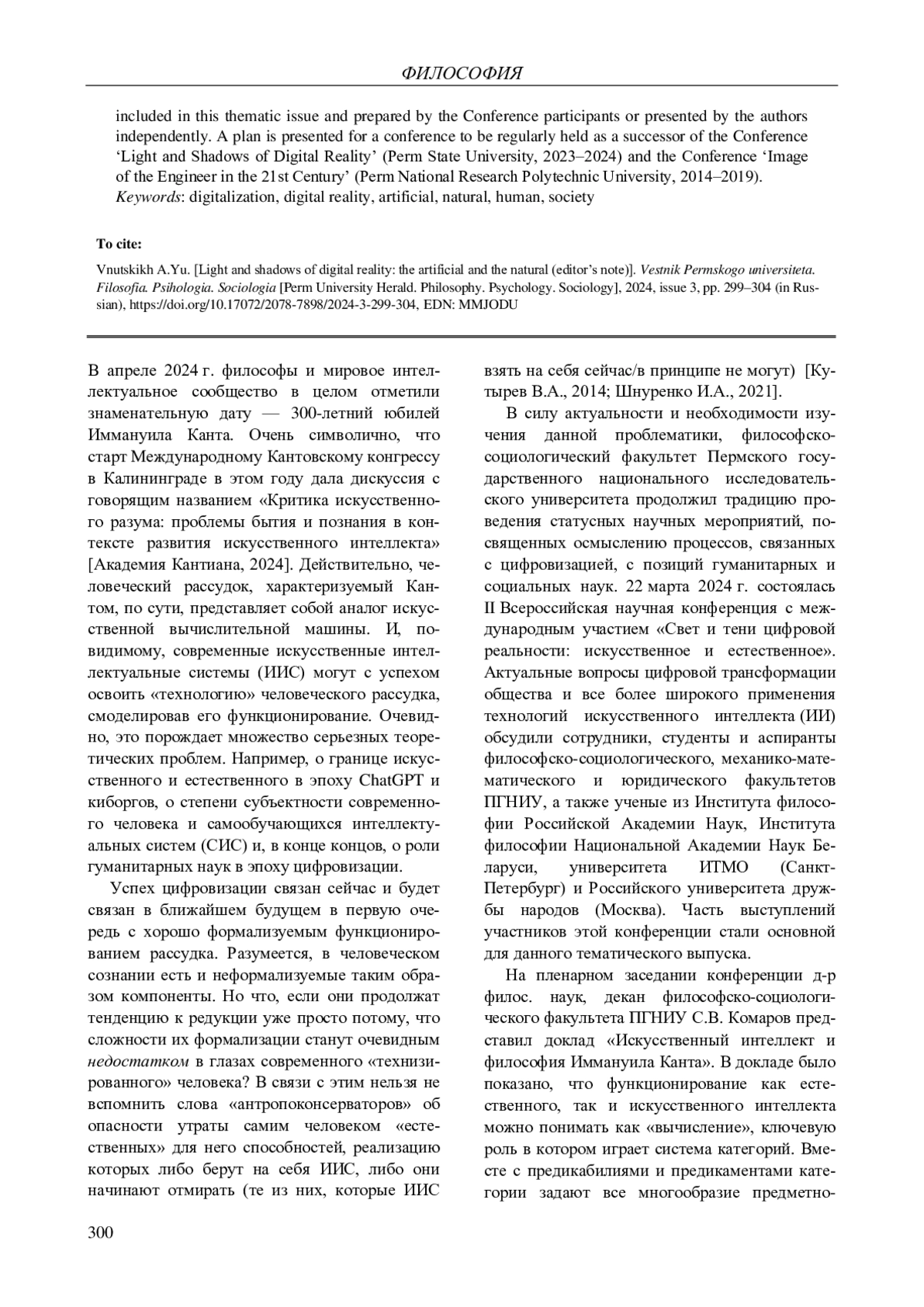 Подчеркивается актуальность гуманитарного осмысления процесса цифровизации, ее достижений и вызовов в рамках широкой междисциплинарной дискуссии. Примером такого обсуждения стала II Всероссийская научная конференция с международным участием «Свет и тени цифровой реальности: искусственное и естественное». Анализируется основное содержание статей тематического выпуска, подготовленных участниками конференции и представленных авторами независимо. Заявлен план регулярного проведения силами двух крупнейших национальных исследовательских университетов Перми следующей конференции, выступающей правопреемницей конференций «Свет и тени цифровой реальности» (ПГНИУ 2023-2024 гг.) и «Образ инженера XXI века» (ПНИПУ, 2014-2019 гг.).