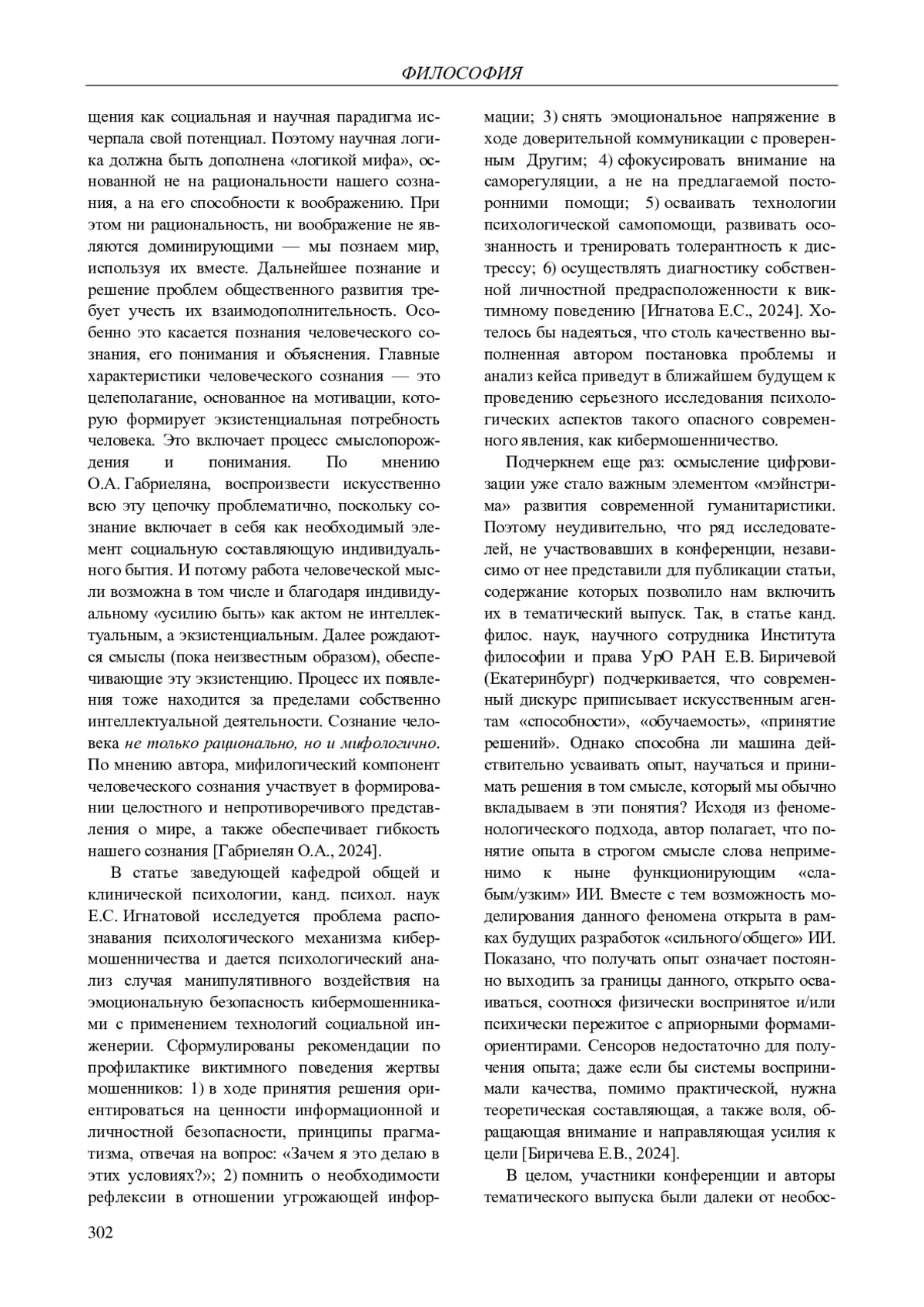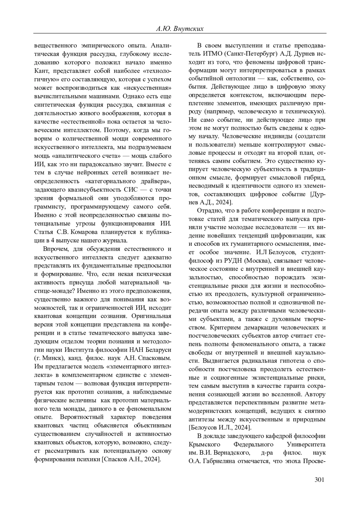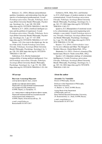 3. 	Биричева Е.В. Искусственные интеллектуальные системы и проблема опыта // Вестник Пермского университета. Философия. Психология. Социология. 2024. Вып. 3. С. 317-327. DOI: 10.17072/2078-7898/2024-3-317-327 EDN: OHSVIP