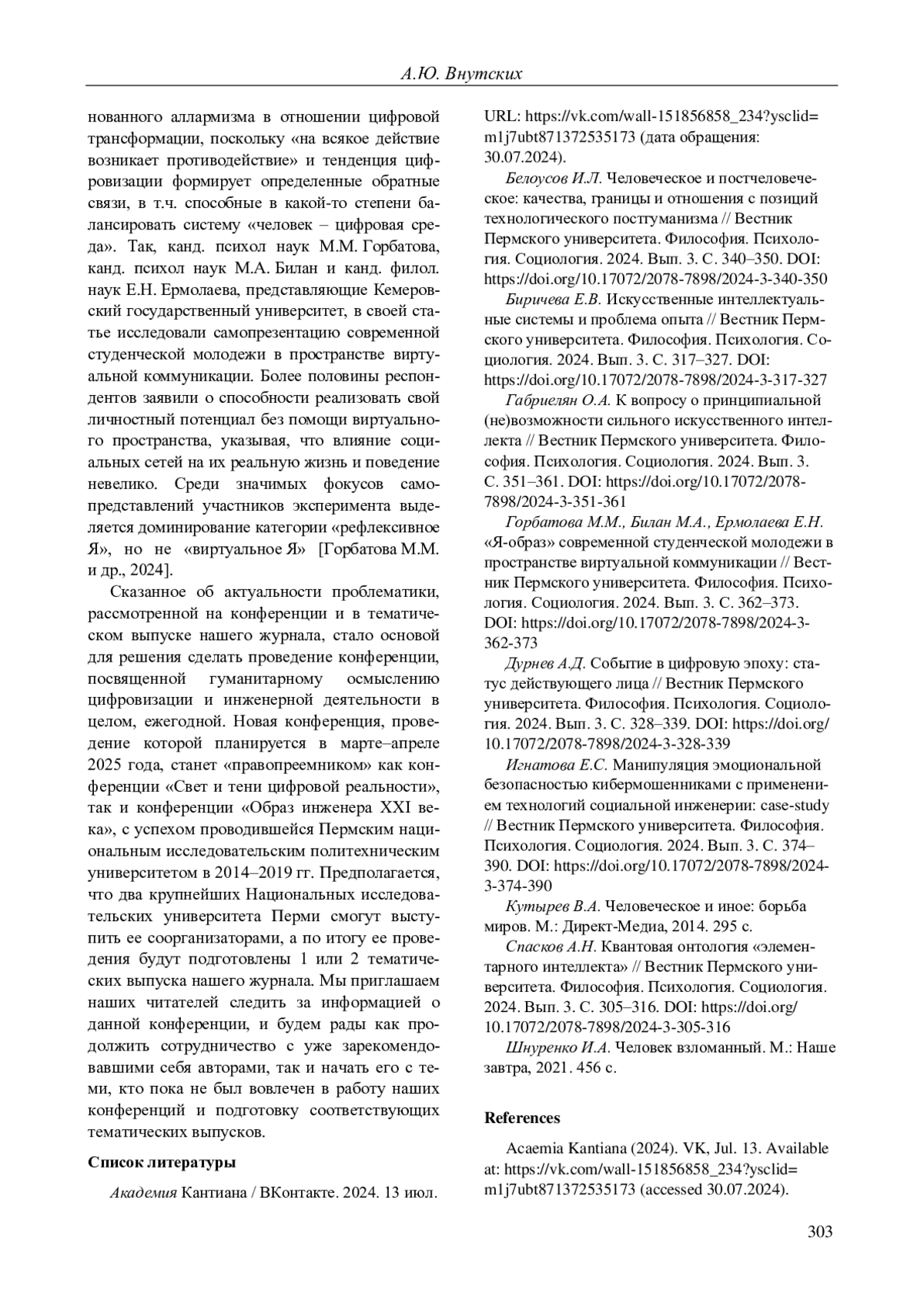 5. 	Горбатова М.М., Билан М.А., Ермолаева Е.Н. “Я-образ” современной студенческой молодежи в пространстве виртуальной коммуникации // Вестник Пермского университета. Философия. Психология. Социология. 2024. Вып. 3. С. 362-373. DOI: 10.17072/2078-7898/2024-3-362-373 EDN: SSCPHC
