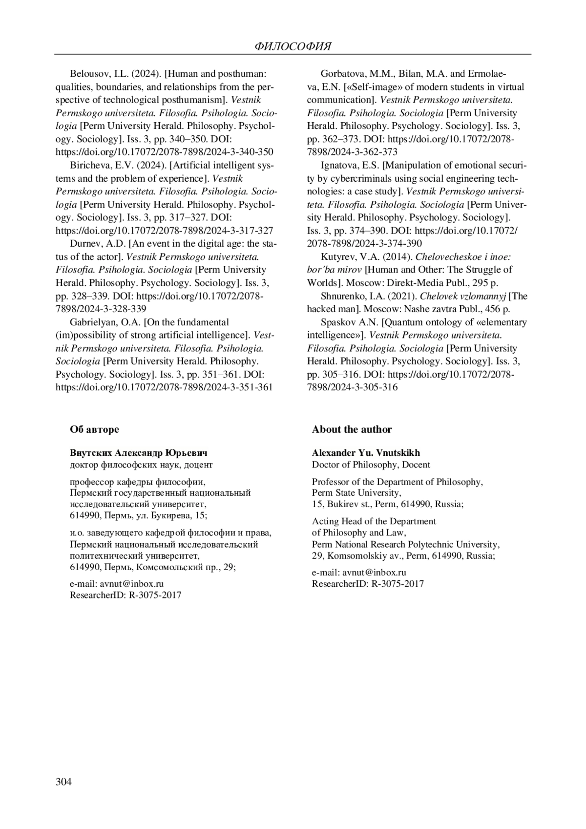 2. 	Белоусов И.Л. Человеческое и постчеловеческое: качества, границы и отношения с позиций технологического постгуманизма // Вестник Пермского университета. Философия. Психология. Социология. 2024. Вып. 3. С. 340-350. DOI: 10.17072/2078-7898/2024-3-340-350 EDN: PUGMTS