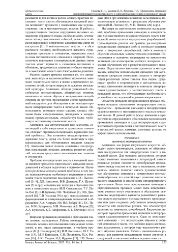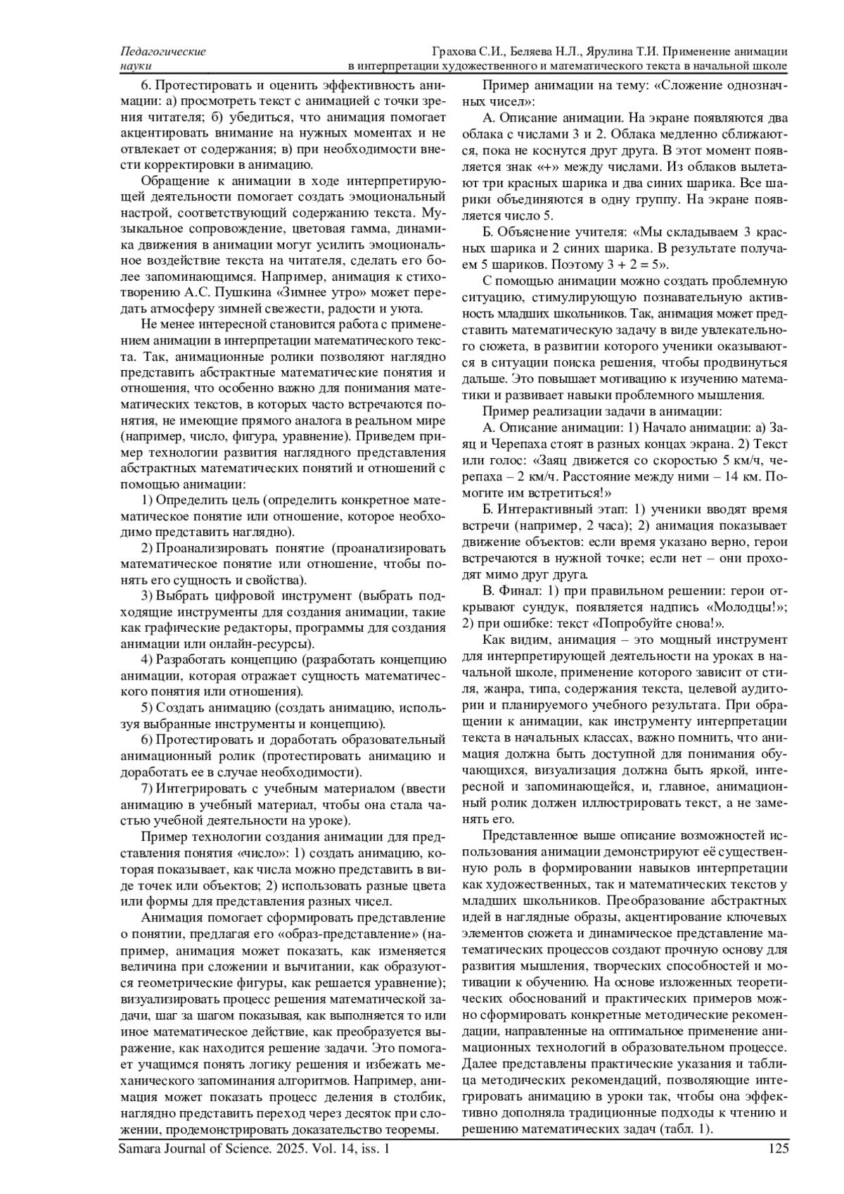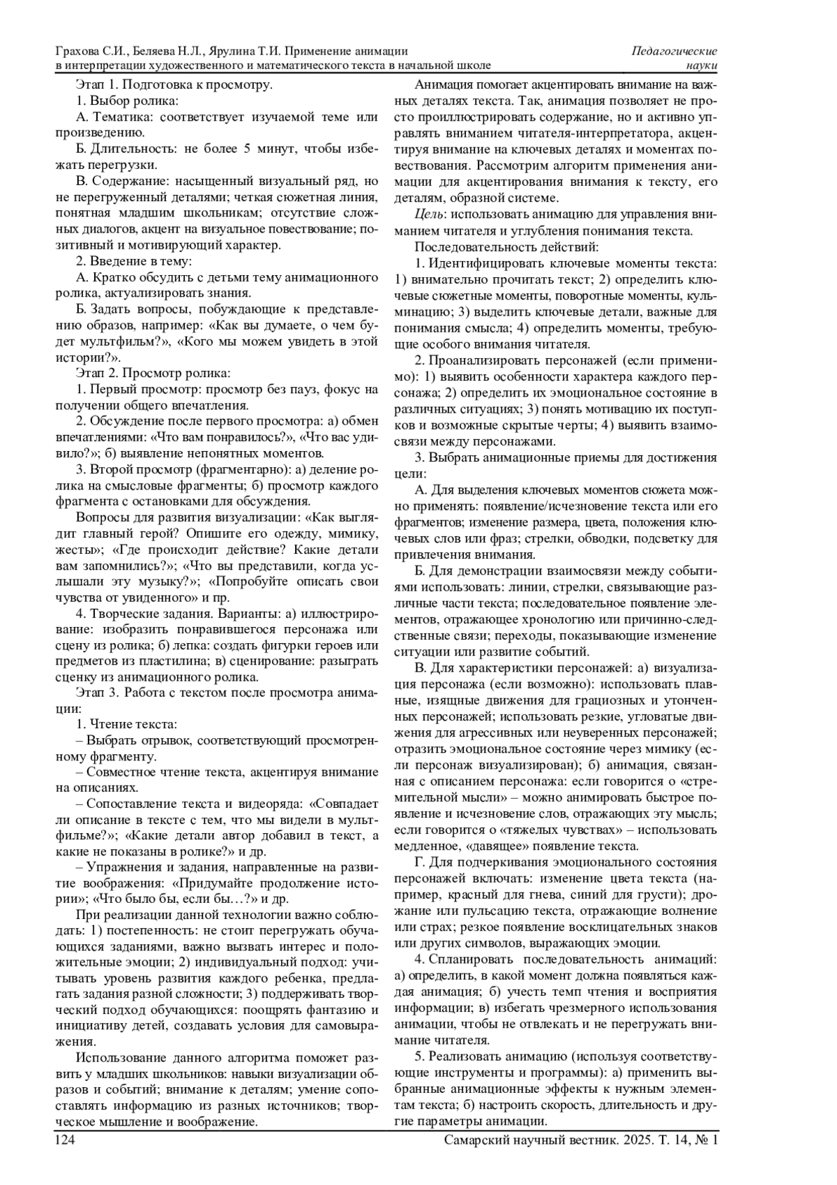 Авторы статьи знакомят читателей с технологией разработки учебной анимации и применения ее в интерпретации художественных и математических тексов в начальной школе. В работе предлагаются алгоритмы действий для развития визуализации, акцентирования внимания к тексту, его деталям, образной системе в процессе интерпретирующей деятельности с применением анимации. Приводятся примеры технологии развития наглядного представления абстрактных математических понятий и отношений с помощью анимации; создания анимации для представления понятия «число», «сложение однозначных чисел» и другое. В интерпретации художественного текста анимация помогает визуализировать образы и события, акцентированию внимания на важных деталях, созданию эмоционального настроя и развитию творческого воображения. В интерпретации математического текста - наглядно представить абстрактные математические понятия и отношения, визуализировать процесс решения задач, создать проблемные ситуации и развить интерес к математике. Применение анимации, как инструмента интерпретирующей деятельности, зависит от стиля, жанра, типа, содержания текста, целевой аудитории и планируемого учебного результата. В статье представлены пошаговые действия для самостоятельного проектирования и разработки анимационных роликов для работы над интерпретацией текста, формулируются практические рекомендации по интеграции анимации в учебный процесс, включая этапы работы с анимацией, примеры заданий и формы использования. Авторы отмечают, что интеграция анимации в образовательный процесс реализуется по принципу «от простого к сложному» и реализуется как с помощью просмотра готовых роликов, так и через создание авторских продуктов с применением цифровых инструментов (программ, сервисов, конструкторов) и, что не менее важно, с учетом основного принципа: анимационные материалы должны иллюстрировать текст, а не заменять его, и быть доступными для понимания обучающихся начальной школы.