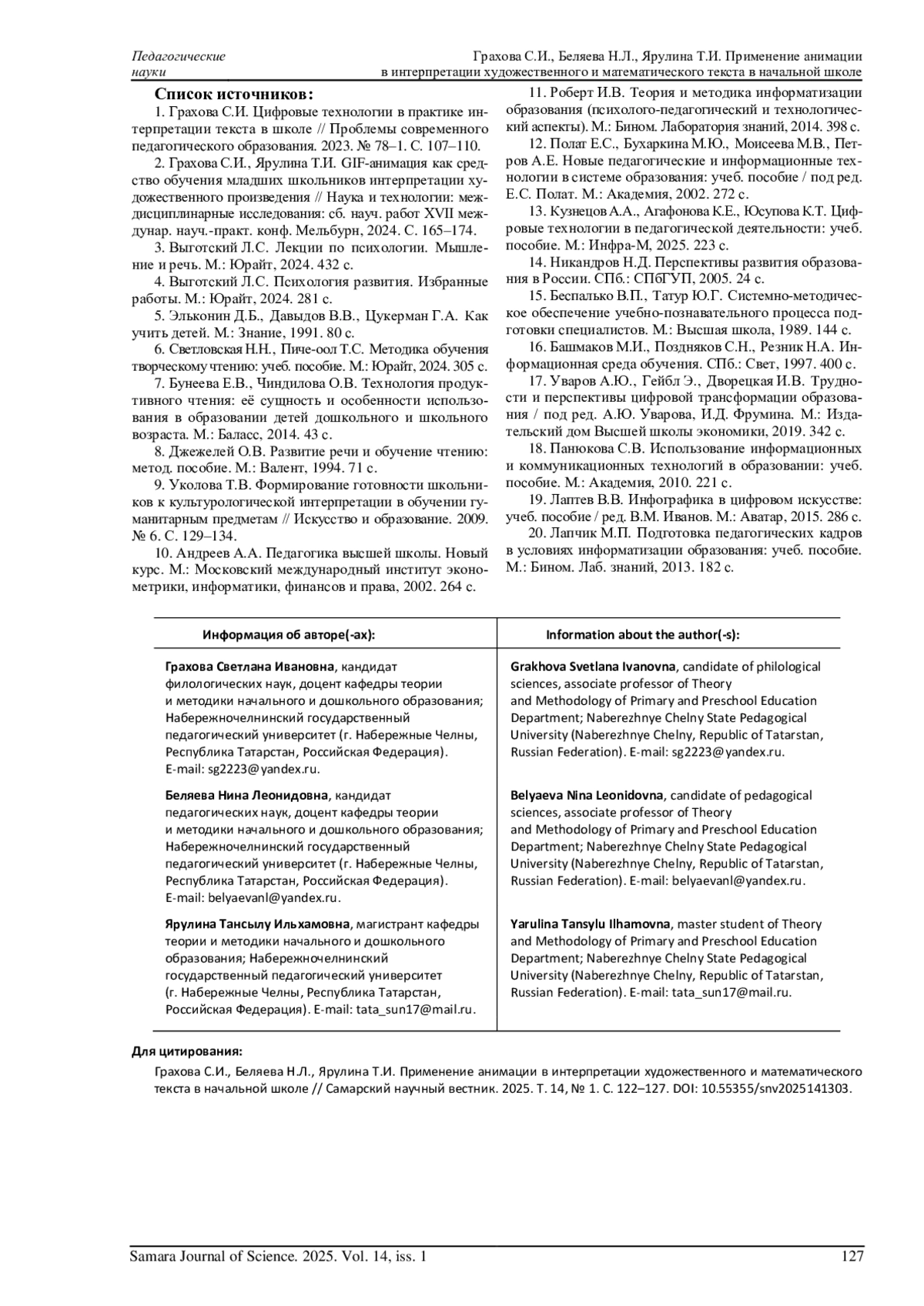 1. 	Грахова С.И. Цифровые технологии в практике интерпретации текста в школе // Проблемы современного педагогического образования. 2023. № 78-1. С. 107-110. EDN: BKCIMA
