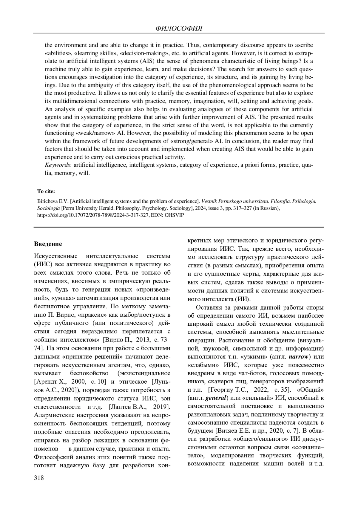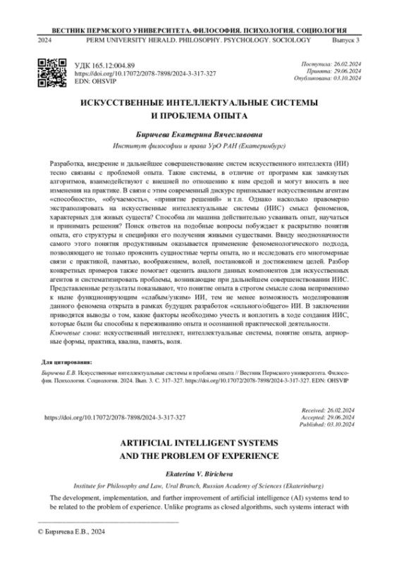 Разработка, внедрение и дальнейшее совершенствование систем искусственного интеллекта (ИИ) тесно связаны с проблемой опыта. Такие системы, в отличие от программ как замкнутых алгоритмов, взаимодействуют с внешней по отношению к ним средой и могут вносить в нее изменения на практике. В связи с этим современный дискурс приписывает искусственным агентам «способности», «обучаемость», «принятие решений» и т. п. Однако насколько правомерно экстраполировать на искусственные интеллектуальные системы (ИИС) смысл феноменов, характерных для живых существ? Способна ли машина действительно усваивать опыт, научаться и принимать решения? Поиск ответов на подобные вопросы побуждает к раскрытию понятия опыта, его структуры и специфики его получения живыми существами. Ввиду неоднозначности самого этого понятия продуктивным оказывается применение феноменологического подхода, позволяющего не только прояснить сущностные черты опыта, но и исследовать его многомерные связи с практикой, памятью, воображением, волей, постановкой и достижением целей. Разбор конкретных примеров также помогает оценить аналоги данных компонентов для искусственных агентов и систематизировать проблемы, возникающие при дальнейшем совершенствовании ИИС. Представленные результаты показывают, что понятие опыта в строгом смысле слова неприменимо к ныне функционирующим «слабым/узким» ИИ, тем не менее возможность моделирования данного феномена открыта в рамках будущих разработок «сильного/общего» ИИ. В заключении приводятся выводы о том, какие факторы необходимо учесть и воплотить в ходе создания ИИС, которые были бы способны к переживанию опыта и осознанной практической деятельности.