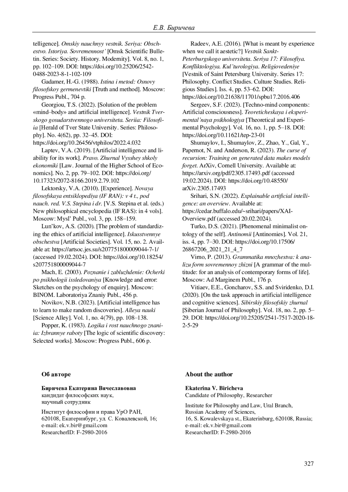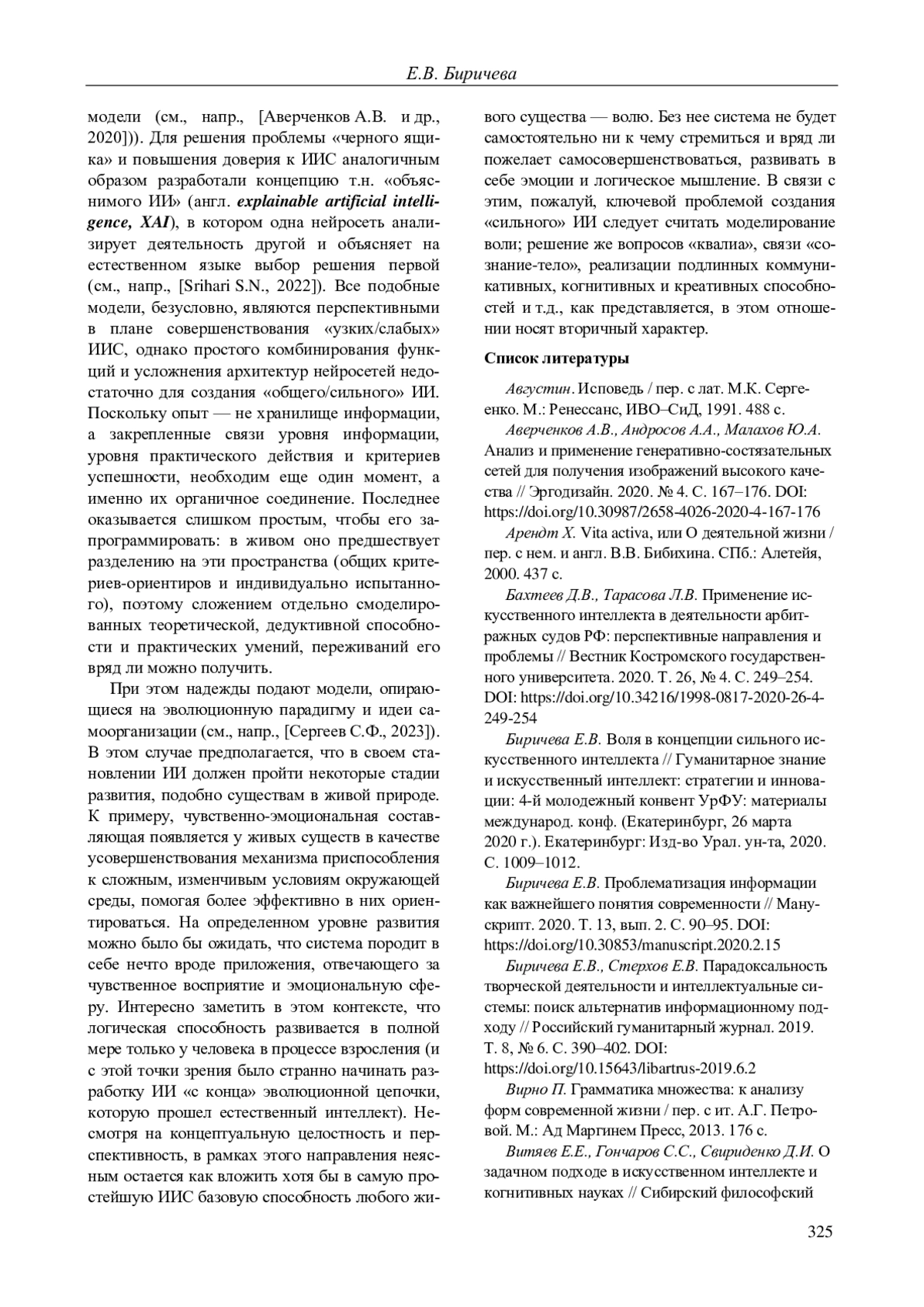 5. 	Биричева Е.В. Воля в концепции сильного искусственного интеллекта // Гуманитарное знание и искусственный интеллект: стратегии и инновации: 4-й молодежный конвент УрФУ: материалы международ. конф. (Екатеринбург, 26 марта 2020 г.). Екатеринбург: Изд-во Урал. ун-та, 2020. С. 1009-1012.