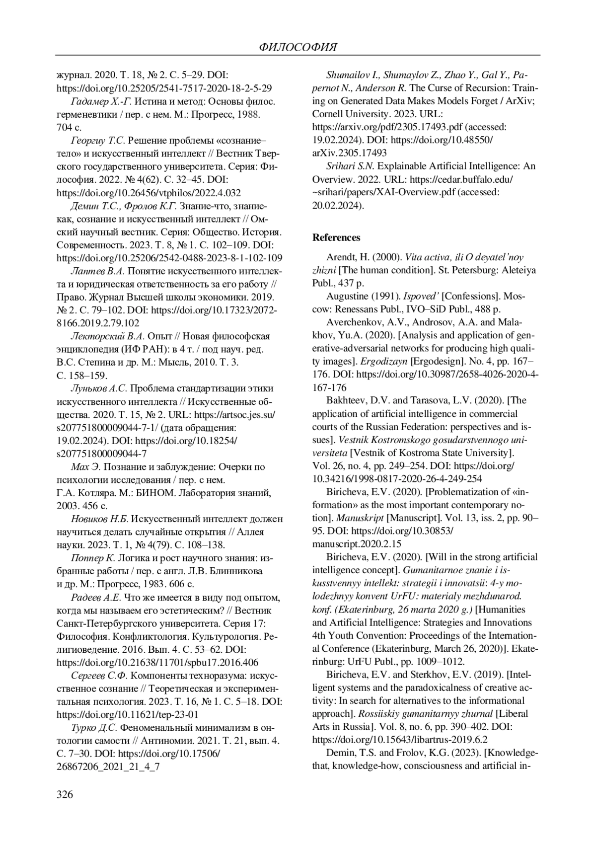 12. 	Демин Т.С., Фролов К.Г. Знание-что, знание-как, сознание и искусственный интеллект // Омский научный вестник. Серия: Общество. История. Современность. 2023. Т. 8, № 1. С. 102-109. DOI: 10.25206/2542-0488-2023-8-1-102-109 EDN: DTOTRC